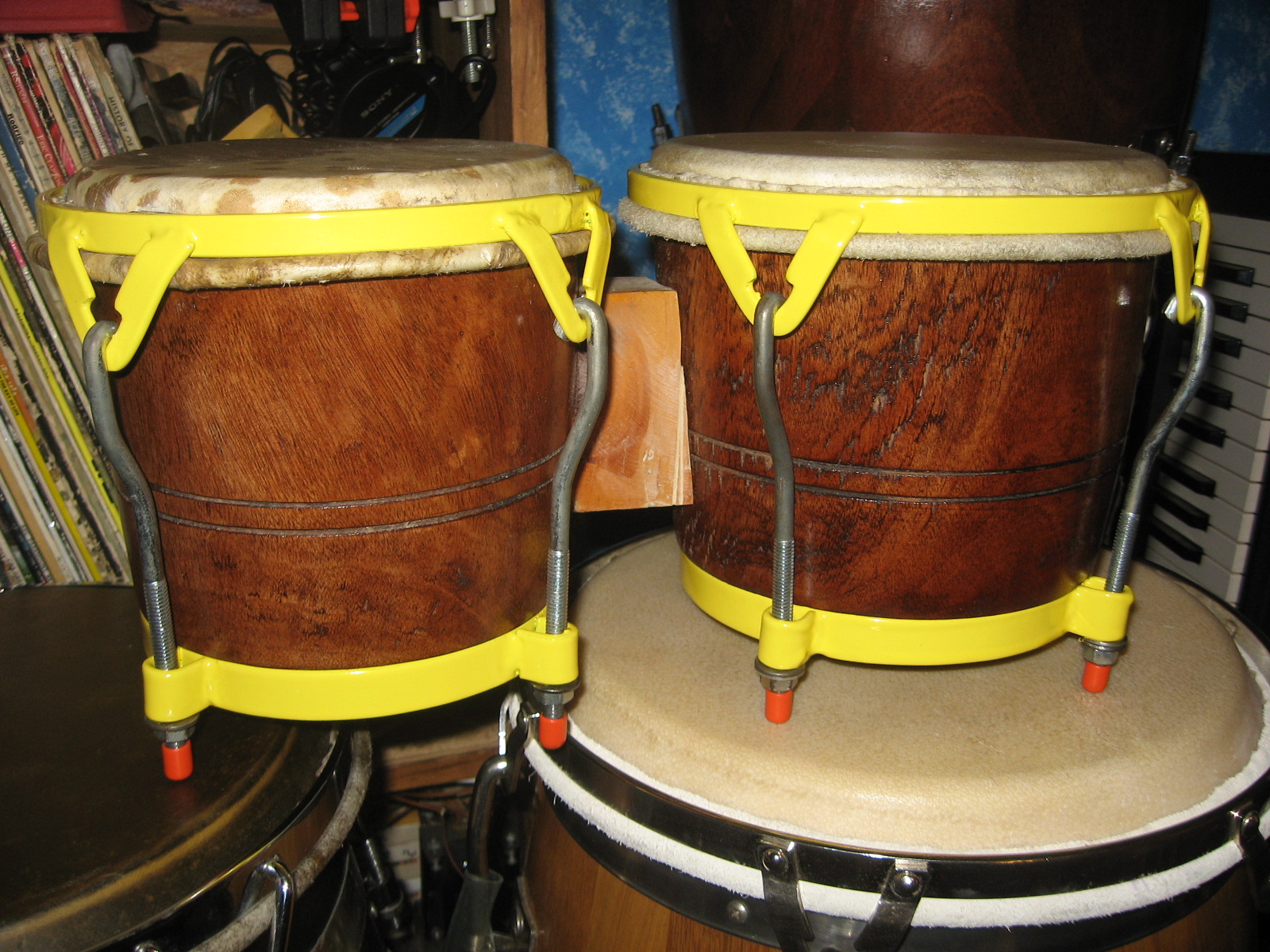 Traditionalist will say there not like Vergara, they are trash, but true musicians will say how do they play, how do they sound, how do they feel between your legs. Beauty is in the eye of the beholder, one mans treasure is anothers trash. Vergara drums were not all fitted with hardware some bongo and tumbadoras were tack head and required tuning with Fuego. Traditionalist at that point swould say that the hardware on a conga was not pure and did not allow for the skin to cure correctly (asi no se cura un cuero). It was a spiritual belief that tuning the skin with fire and cleaning it off with a little rum brought certain quailities to the skin and hence the drum. I love drums and all have different tonal quailities that I enjoy for different reasons. With that said I had the hardware rims powder coated yellow on these solid shell bongos for those of you that say interesting I say than you for those of you who say there not like whatever I say get some progessive thoughts in you .