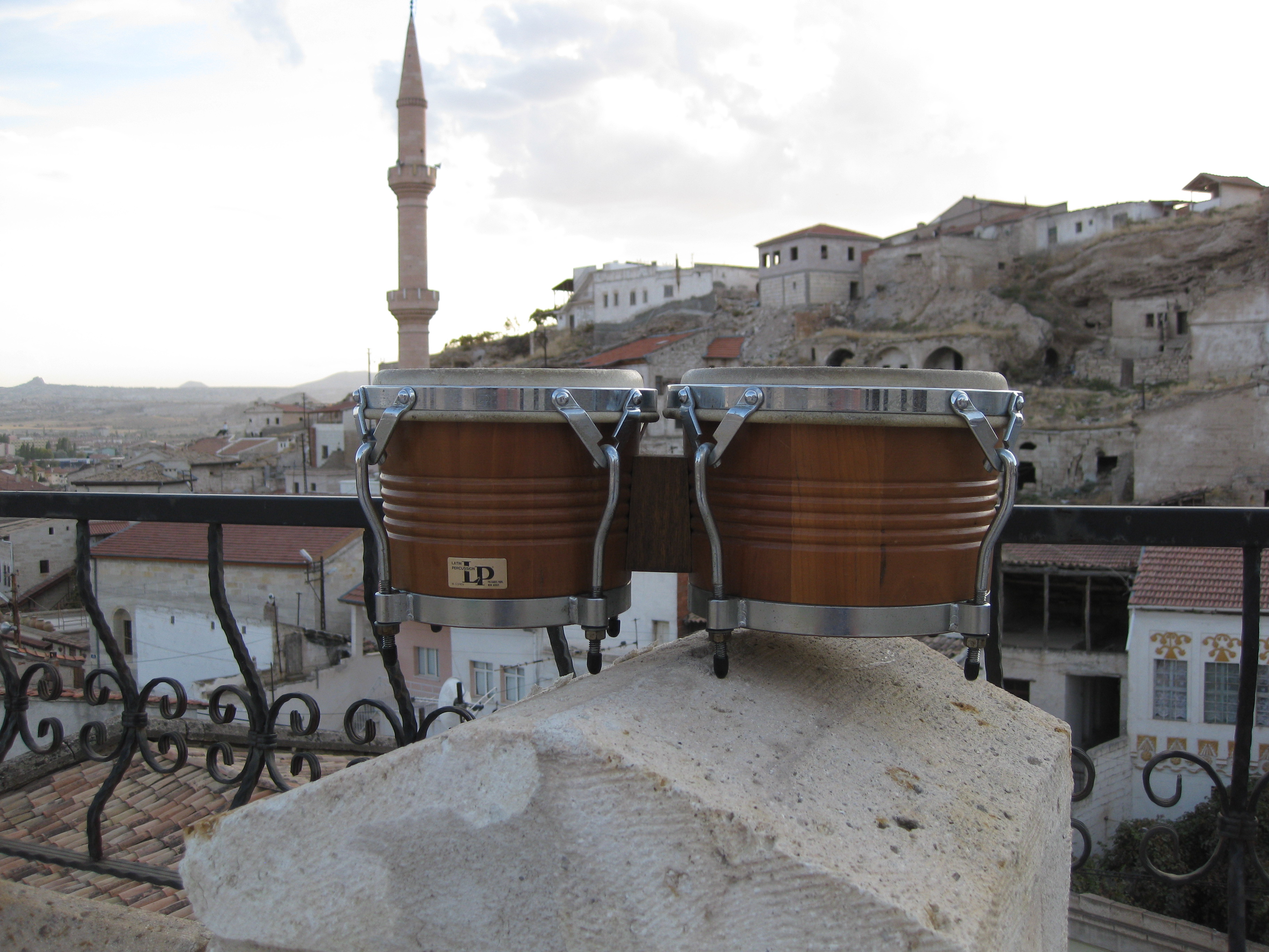 Caballobello, Actually my very very first bongo was a cheapo candle tuned Zim Gar but I realized right away I needed something better and headed right to Manny's - I think I paid about $75. I fiberglassed the cardboard box and used it as a hard case for years. Don't know what ever happened to that Zim Gar. Good spot, that guy on the roof, I hadn't noticed him. One of my neighbors catching the rays. Cappadocia has enough sun to have solar hot water most of the year - even in the cold winter.