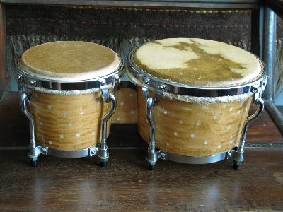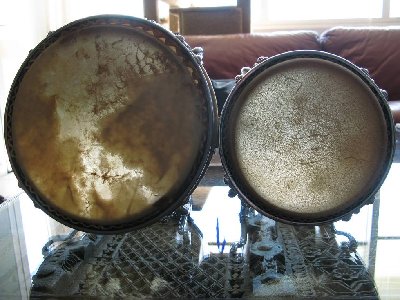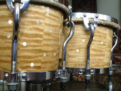 I just received a custom bongo drum from Matt. Last year for my 50th birthday, I ordered a custom bongo from Matt. Matt asked what I was looking for and I said something special; surprise me. It took a little over a year to get to me. Matt has been too busy to answer me questions so I am not exactly sure what I have. I measured the outside dimensions (rim to rim) and the hembra is 10" and the macho 7.5". Lots of mother of pearl inlay. The wood and skins I am not exactly sure what they are.