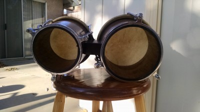 Bongoceros, Have any of you ever seen this type of bongo with three lugs? It is quality built bongo of mahogany with a nice bearing edge and although the hardware is only three lug it is solid. I found it at the local Goodwill, casi regalado. I hope someone will have an idea of it's origins.