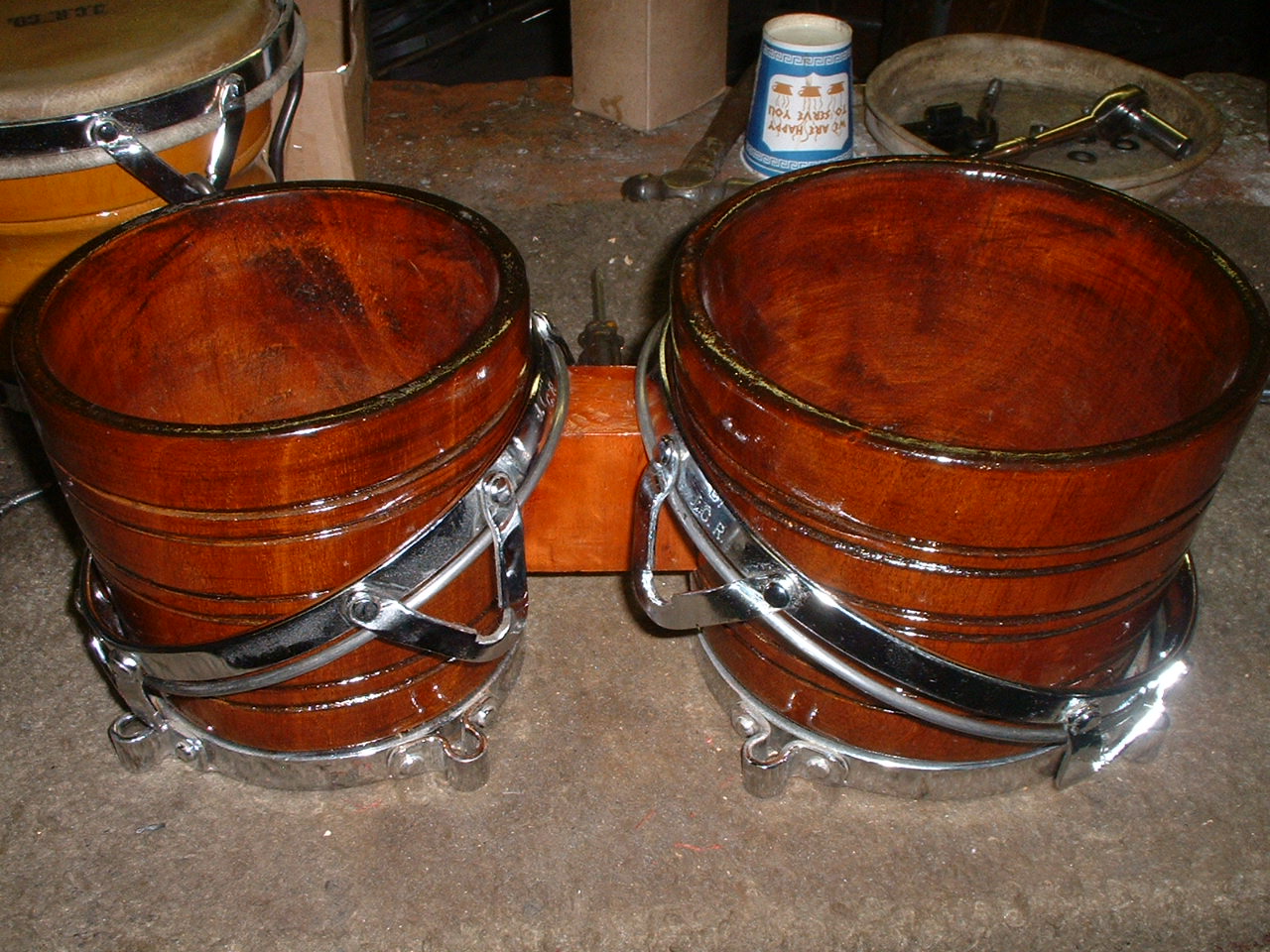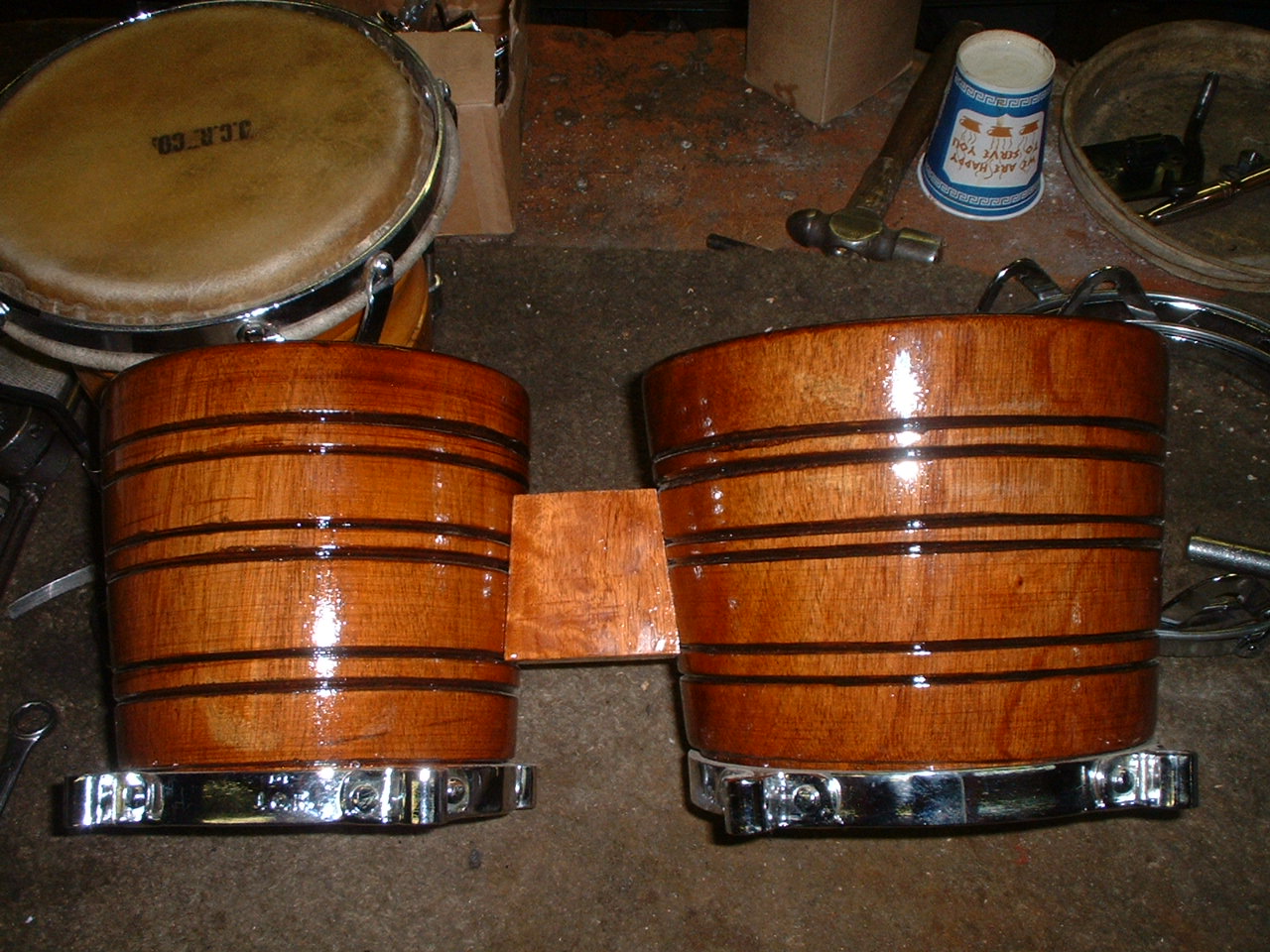 This is the almost completed Bongo ,Puertorican Mahoganny from Aibonito P.R. 20 years old unfinished ,and finally completed by the master craftmans from JCR percussion .Thanks to MR. Cali Rivera and company.ps. Cali Call this Bongo ,"El Alacran" wihich means the centipede or the scorpion. One solid piece of mahoganny 7macho" to 8"embra and 3/4 of an inch longer for better solid sound like Ismael,s Bongos.Thanks again