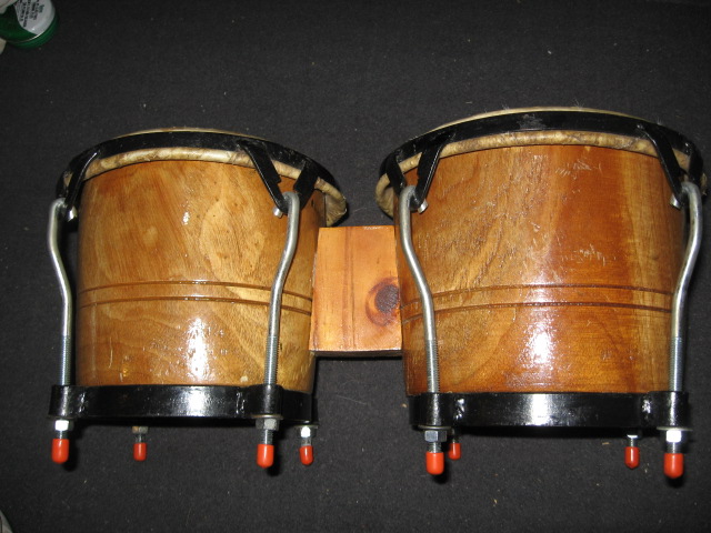 My latest aquisition are a pair of solid caoba shell bongo, because of the hardware I'm thinking there from Santo Domingo. The hangers on the hoops look like they were welded by a novice and no polishing was done to the weld points or metal in general but its funtional. The skins are chibo and sound F'ing great dulce para las orejas. I might change the hardware but the chibo macho is going to stay. They are taller than any of my other bongo and the project like concert bongo. There like canons between my legs, now I feel like I have three there LMAO. Pita Can~on. Just thought I share these and if I refin and put new hardware on I will post flics later. ***** Gentelmen and ladies I just listed these bongos on ebay due to my have recently purchased Valje bongos and finacial situation (I'm out of work) these would make a great candidate for a renovation from Cali or Matthew Smith, Just thought I would let you folks Know.*******