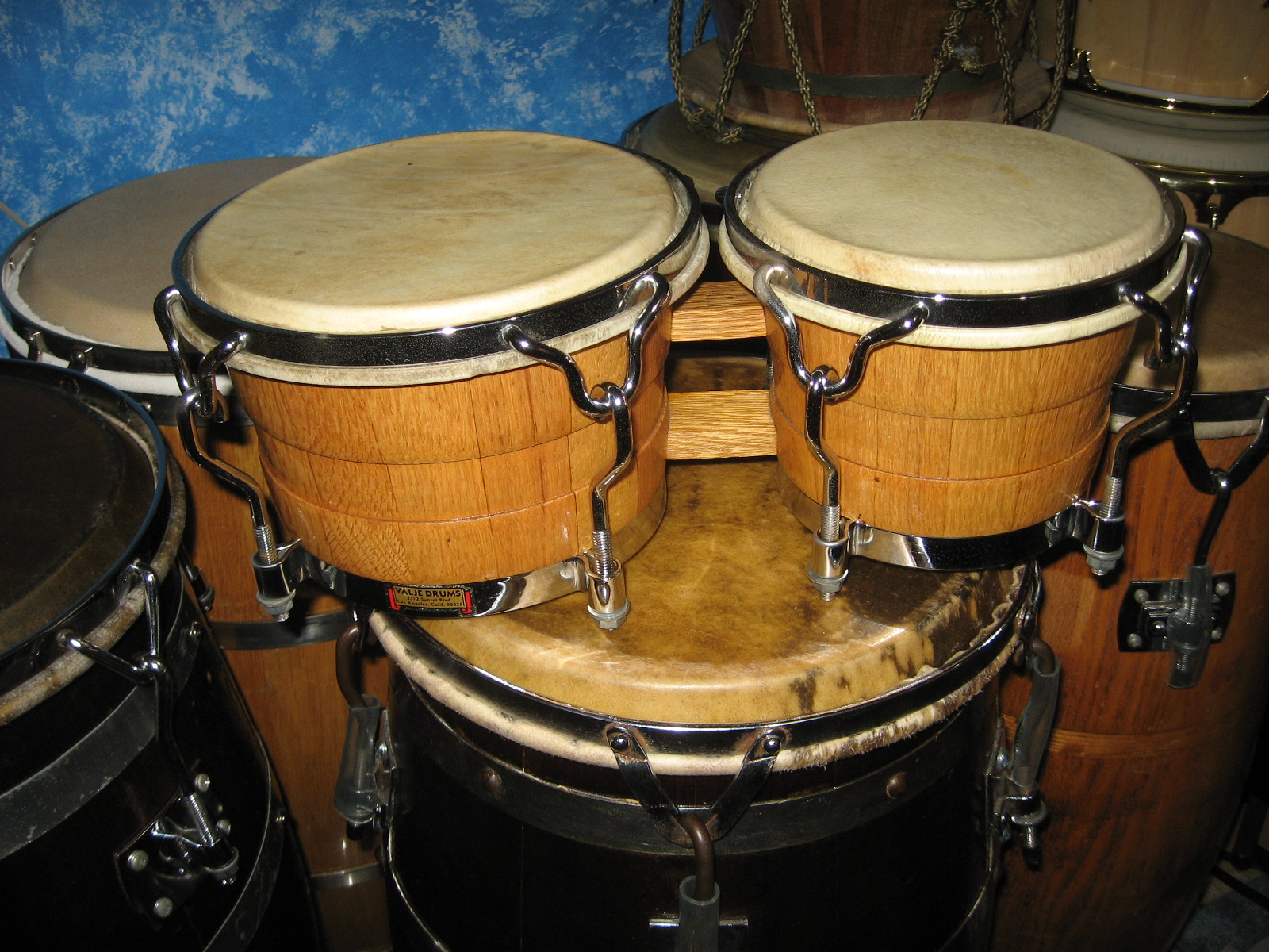 I have a similar pair of Valje bongos that I got from John "Dandy" Rodriguez, (T. Puente, Tipica 73" Ray Barretto), in my book the tastiest bongocero in the business for the last 30 yrs. I sent photos to Ralph in Resolution Drums (Tom Flores son) and he told me they are from the late 60's (67/69). Mine have the extended collar,(about 1" below the bottom hoops) which were called concert bongos. Enclosed see photos,including "Dandy" with them.