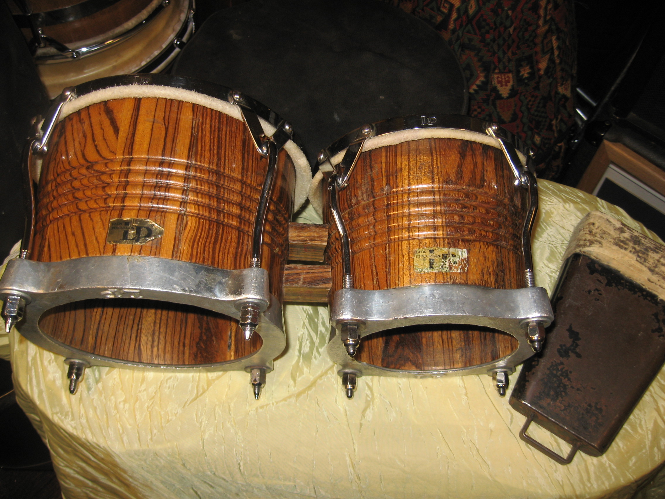 I've had mine since early 70's and they traveled with me all over the world while I was in the NAVY for 20 years. They have played extensively in all types of music and have gotten many years of play. These are my second set of LP's from the early years I brought them at either Mannys or Sam ASH on 48th street brand new after I got my Mahogany set. I think they were about $150.00 which was alot considering Junior sold his congas at that time for about $150.00. But everyone was into LP at that time. They look a bit rough but those are battle scars and each nick and dent represents great memories for me. The color has darkened through the years I remember they were brighter when I first got them. I never new they were colectible but new they were desired since at gigs guys were always trying to buy or trade them from me. The bell you see in the photos is an old LP from the same time incredible sound. I used to say the wood was called Tiger wood until someone here told me they were refered to as Zebra wood and had them already for over 35 years your never to old to learn something new, and if you think you do know it all as many here do guess again, LOL. Have a great Thanksgiving or Dia De Gracias to ALL.