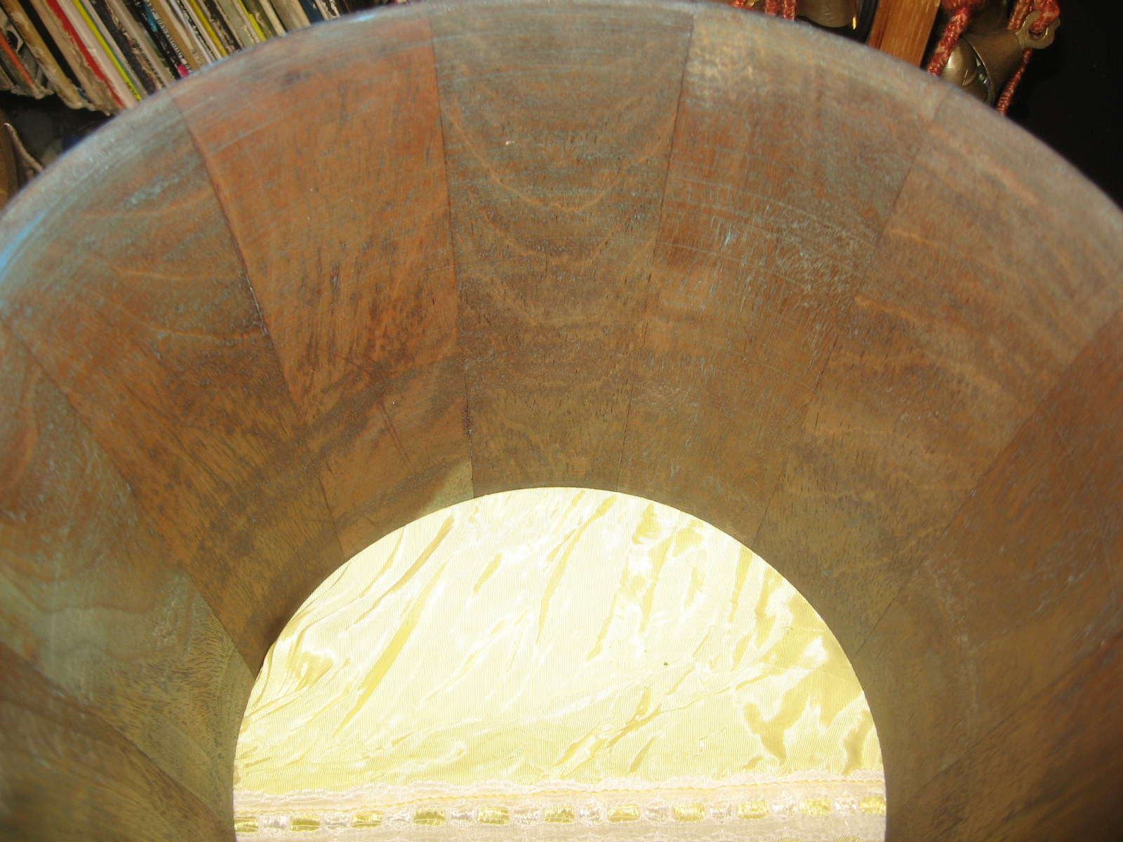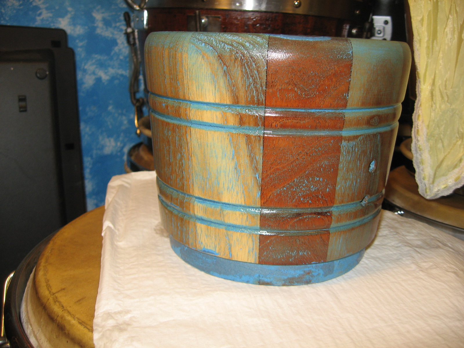 I had listed a pair of Sonoridad Cubana bongos on Ebay but they didn't sell, I was surprized. So I decided to keep them, they sound good but they were painted blue and did not fit in with my taste of natual wood hues. I thought I would start by stripping the light wood on the inner shell to see what the wood looked like. Low and behold they are Caoba the grain and hue are unmistakable. What has me puzzled is that I belived these to be fairly recent but I know that Cuba has a prohibition of using Caoba on instruments. Does anyone know when this law was put in effect which would help me to date these. Here are some photos of the shells. If you double click on photos they will enlarge for better detail. The blue color is factory and I actually saw a set like this being played on a Cuban video but can't find it now.