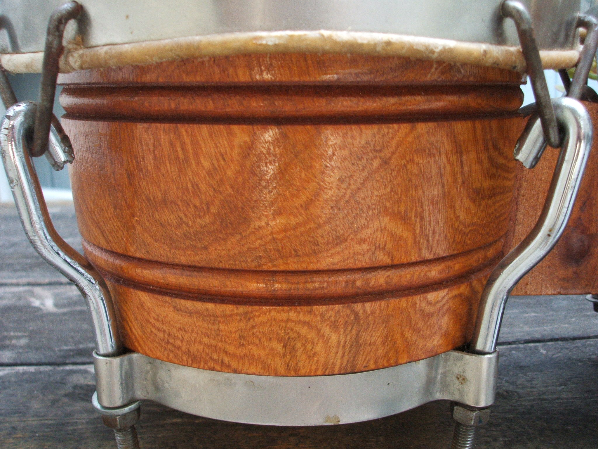 Just picked up these solid shell bongos made in Cuba. As you can see the hardware is junk, but the shells seem pretty good. I welcome any help identifying the wood and the maker of the drums. The drums are pretty light, no doubt partly due the the lame hardware. The macho is 6" and the hembra is 7 1/2". Anyways, it's been a while since I've had a drum project. Tinkering with old drums is almost as fun as playing them.