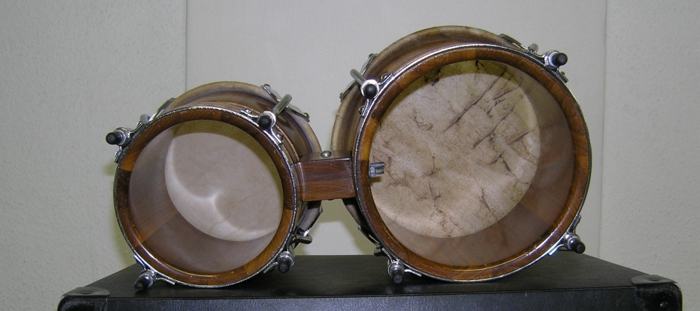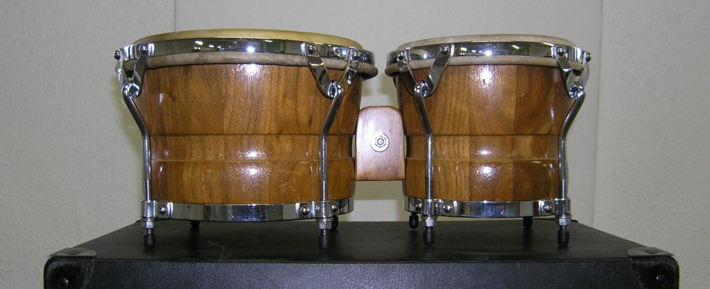 This here is for skinslapper and anyone who loves to see pictures of nice bongos: Gon Bops walnut bongos 7" & 9"" with 4 hooks on each drum, ca. 1976-83. I drilled a hole (filled with a screw) to mount the drums on a stand. The foil badge was ruined, and one day I just scraped it off. I have never been an instrument collector, but I'm not sure whether I would still be as careless today. Anyway, the bongos don't just