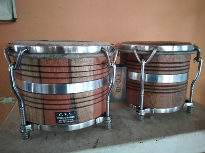 Saludos, Cvs Percussion Bongó by Charlie Vega. Made of Cedar (cedro & Capa prieto) and Salmwood. 7.25 X 8.5 very well made and not heavy at all. Just got it today so I have not play it yet. The only thing I did was to rub a little conditioner onto the skins and let it set for the night.