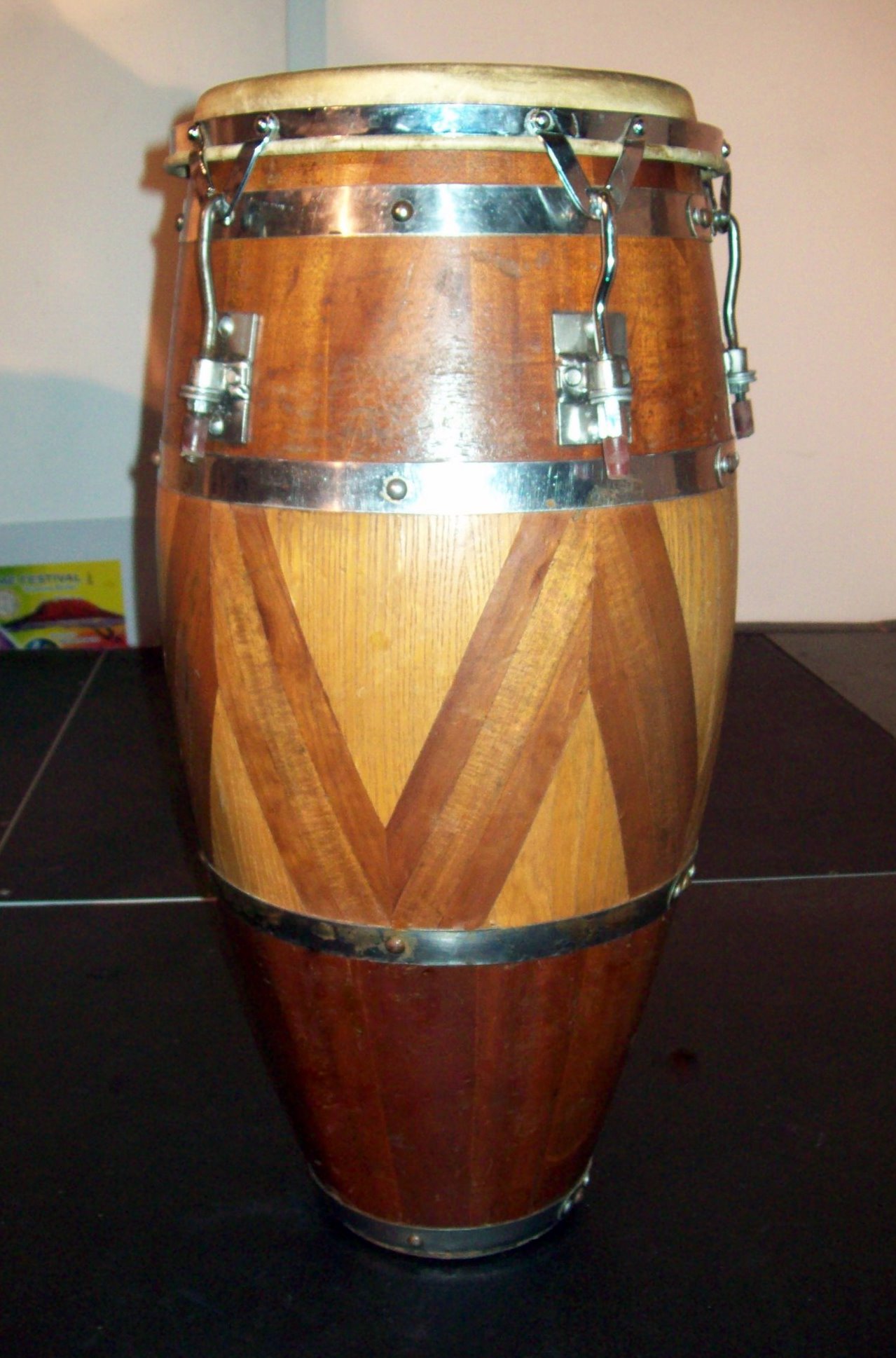 A Mahogany tumbadora made by Nataly "Junior" Tirado Ruiz - with an interesting inlaid middle section.