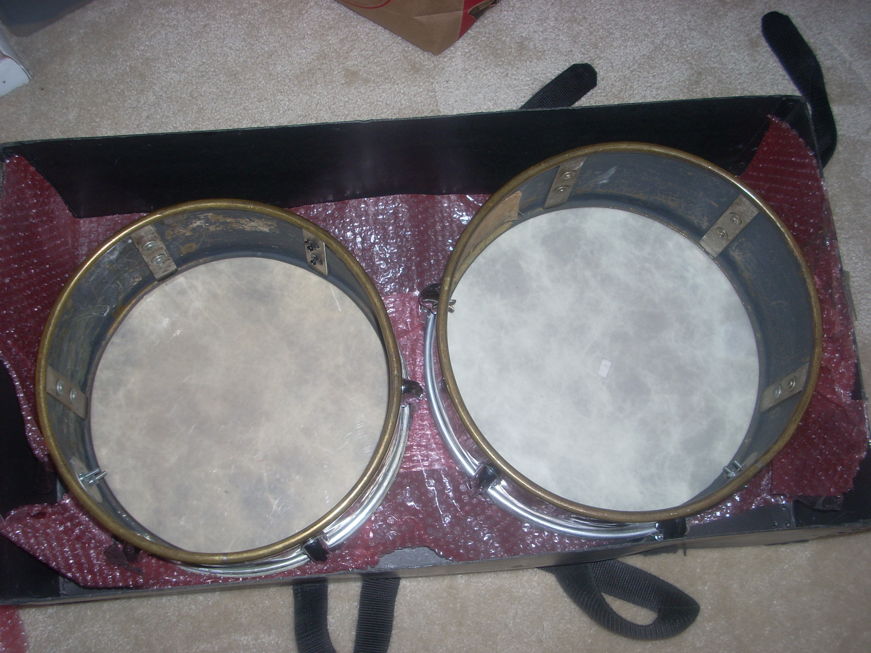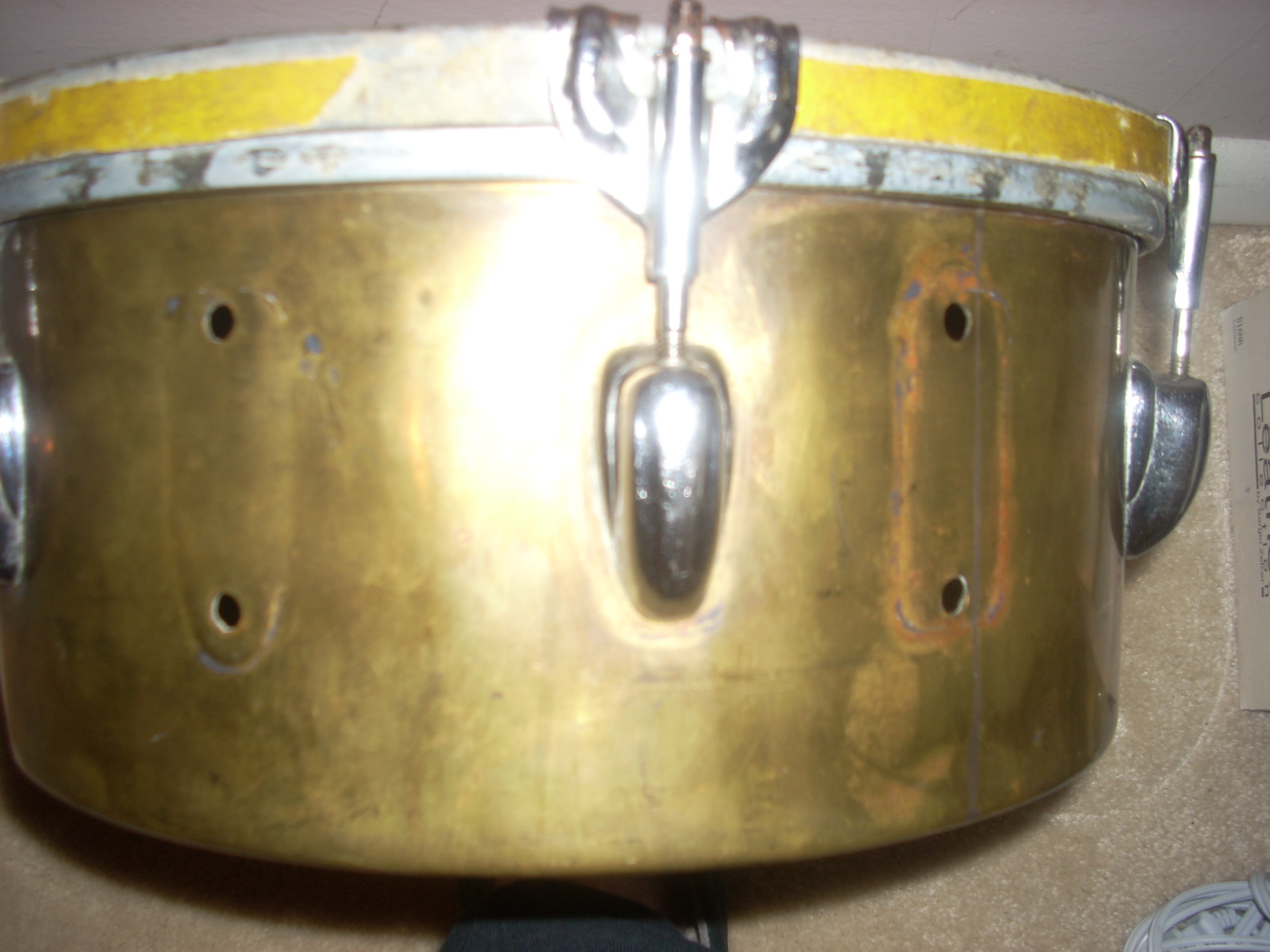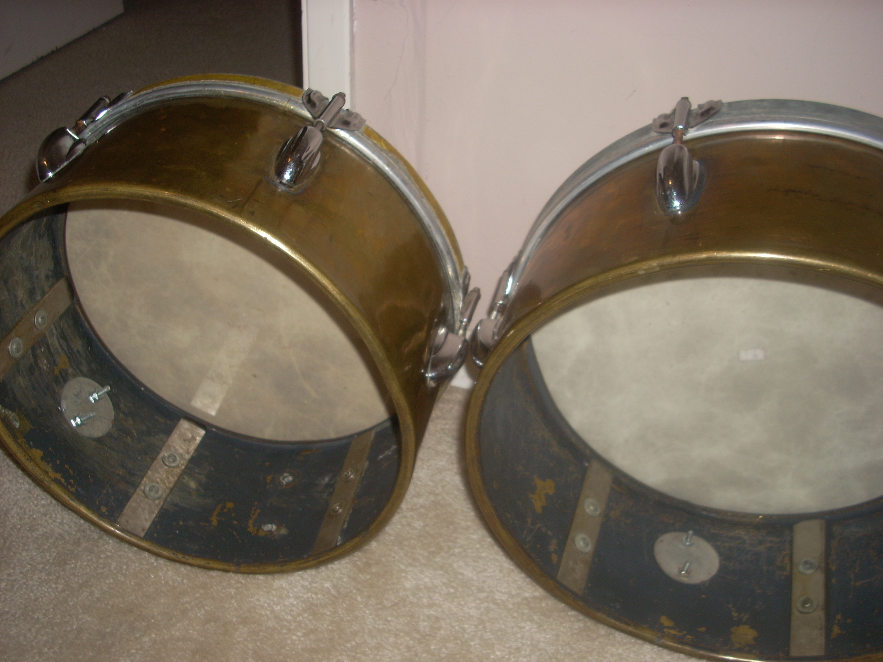 JC, I have eyed those shells since you showed them to me. I have the replacement parts ! the Slingerland leg / bell post castings that fit the holes in the shell, But I'd never replace that bell post system, see how it dents the shells & leaves an impression of the part ? But These are the heavy Brass shells, not the thinner ones that Slingerland changed to. These are as heavy gauged as Leedy but are a shallower shell. I want to do a complete restore on them, re roll the shells to make the more perfect round, do some body work on the dings & dents , in prep for being media blasted & re laquered. I would remove the galvanized zinc plating from rims, true them up to be flat level, re bevel the edges for the sticking egdes. Fill all the holes w/ Brass and rebuild the timbale mount etc. YOU wanna trade some thing ? You know I am the President of the Broke Assed Congueros Foundation ! ? lol I have a mahogany GB quinto ? The match is on sale at Trading musician * I'd hate to see some bozo buy them if he cannot fix or repair or restore them.