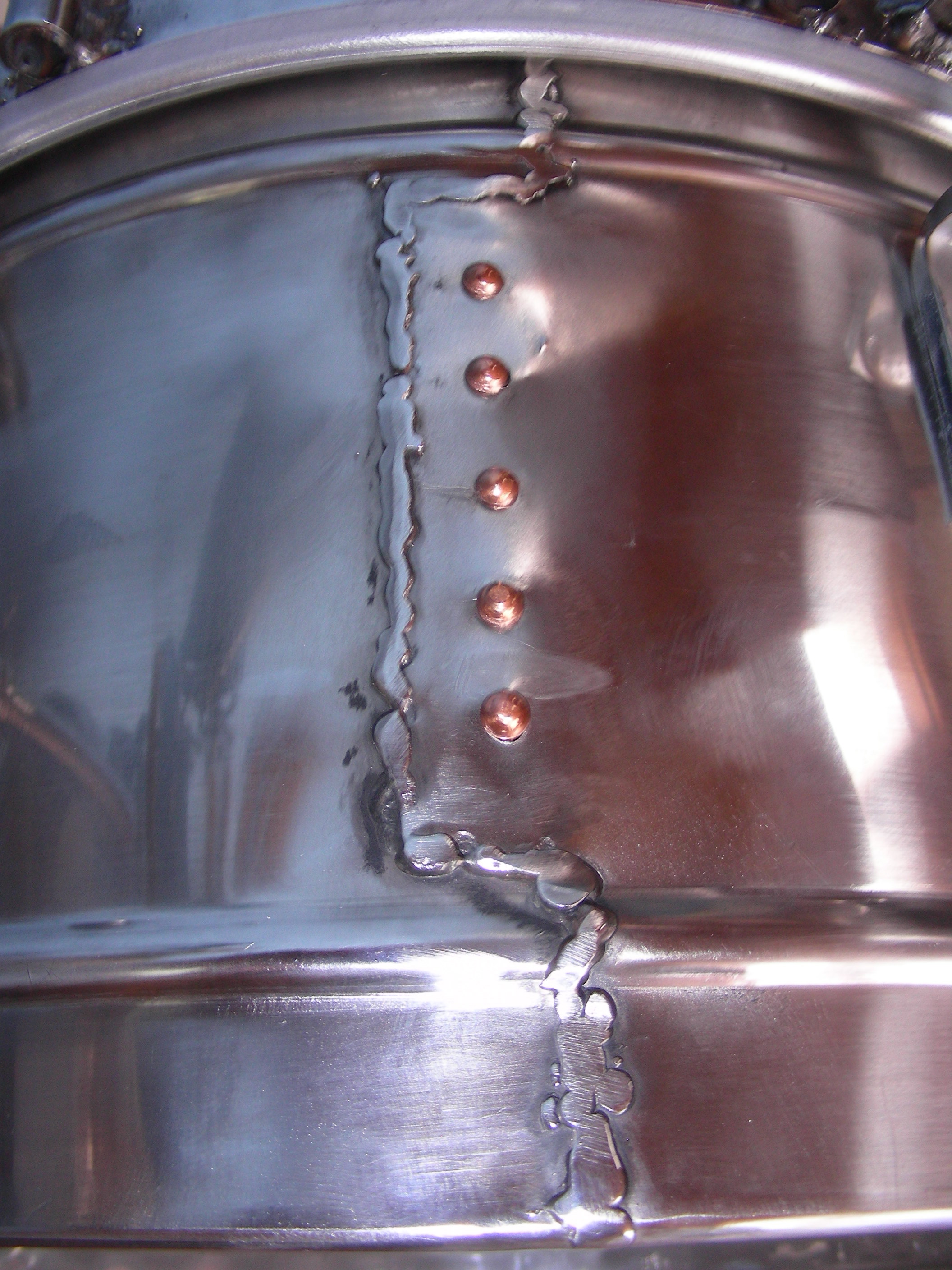 Anyone consider the possiblity that an ugly weld MIGHT contribute to a drier sound? In the automotive world, a steel crankshaft that is not cracked will ring like a bell when tapped with a wrench. Yet a steel crankshaft that has a hairline crack will just go "dank" when struck. Slight imperfections break up the harmonics of the ringing. Perfect material allows the ringing to sound out nice and clear. Perhaps this might correlate to timbales, just a thought.