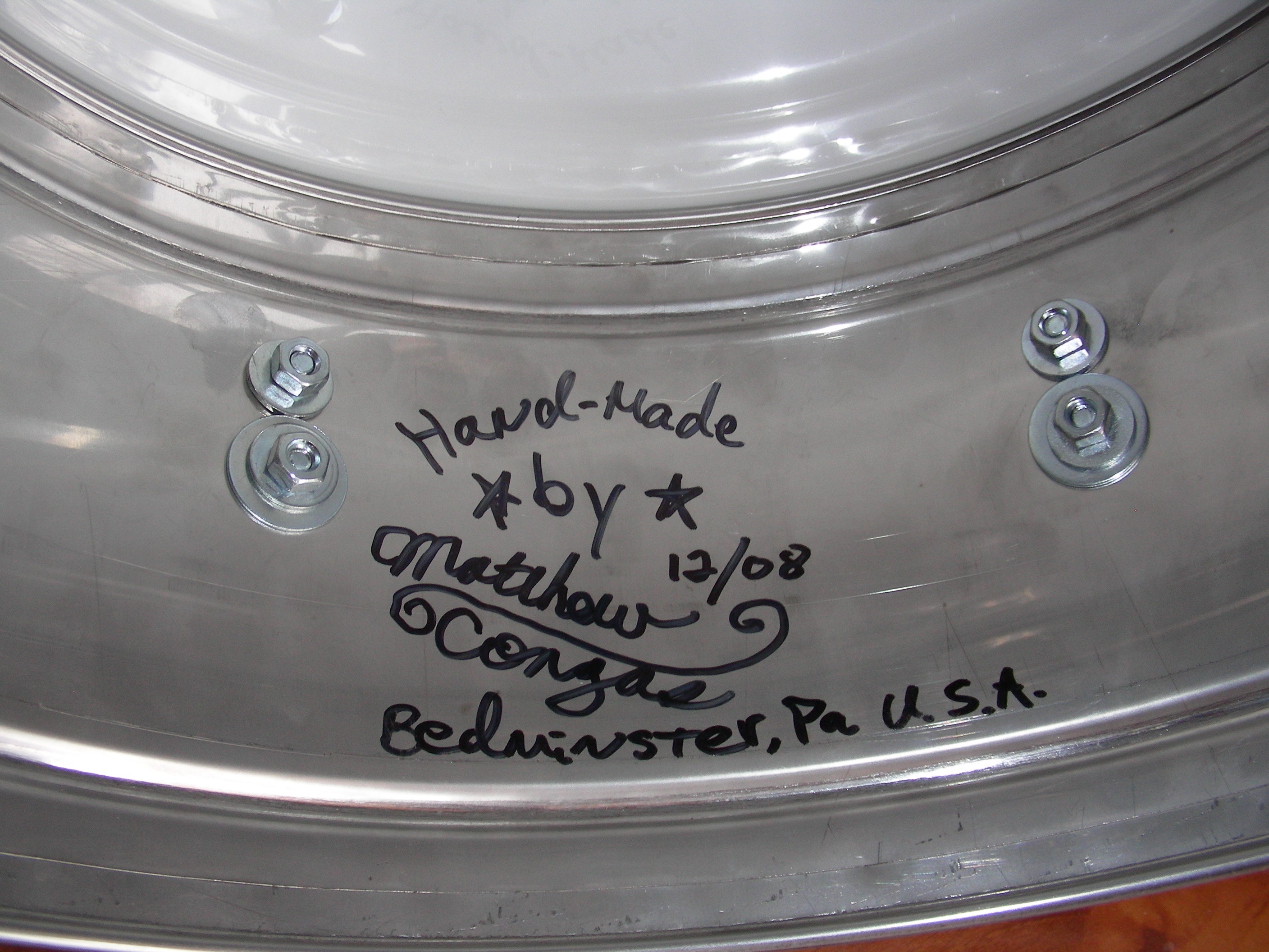Here are some more photos. I have a few more, too, if there are of interest to anyone. I should add that Matthew Smith is a gracious gentleman to deal with, and I feel very privileged to have these instruments. He is very analytical about his work, and very historical-minded. His bells are great, too, and I know that he aims to make instruments which sound distinctive. BTW, he normally supplies a Gibraltar stand with his timbs, but I already had an old LP "Everything" rack I wasn't using. So, he supplied me with the timbale mount on the appropriate sized tube, to use with my LP tripod. Finally, thanks to all who contribute to congaplace; I've learned a lot from reading the posts.