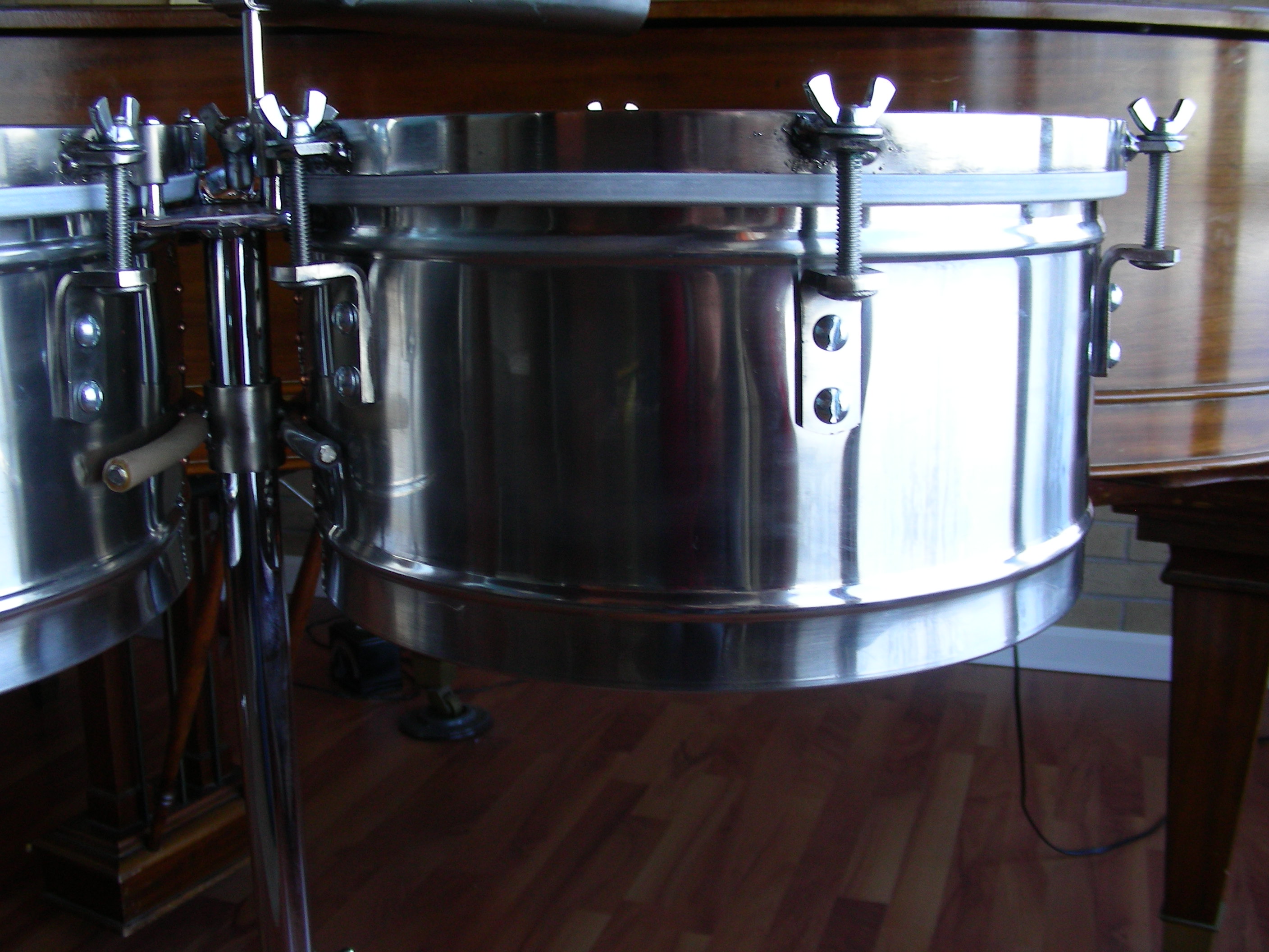 Sorry to have set loose the focus on wing nuts! Someone asked if anybody owned Matthew Smith timbales, and nobody else had responded. I wanted to give Matthew some recognition here. I mean here is a guy who not only makes truly great congas and bongos in the traditional style, but can also great bells and timbales. And he's not buying the shells from somebody; he's riveting and welding them up himself! I don't know if he has made a lot of these instruments, or if they are relatively rare. He also makes a deeper set with more conventional crowns. So, I just wanted to show these off a bit, you know? I also want to contribute something to the discussion of shell materials, etc. The cascara sound of these timbales is, I think, unusually dry. I think that this has to do with how the shells are made as well as what they are made of. Matthew has said that he will send me some further information on the construction of these timbs, and I will pass it along when I receive it. I shouldn't have earlier said that the drums sound dry overall. I took them upstairs into a larger room to take the photos, and the hembra sounds very resonant in that room w/o carpet etc. Finally, I'll repeat what I said earlier. I regret not getting calf heads right away. Based on my experience with calf heads on snare drums, that would make more of a difference to the tone of your timbales than anything else. Also, the stick response with calf is superior. But, I'd still like to know how those calf-wrapped crowns work with rimshots. Does it mute them? And does the calf wear out at the crowns because of the rim shots??