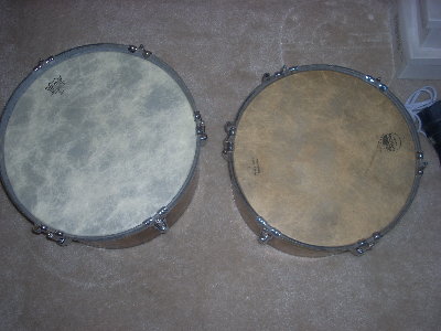 JC, I have eyed those shells since you showed them to me. I have the replacement parts ! the Slingerland leg / bell post castings that fit the holes in the shell, But I'd never replace that bell post system, see how it dents the shells & leaves an impression of the part ? But These are the heavy Brass shells, not the thinner ones that Slingerland changed to. These are as heavy gauged as Leedy but are a shallower shell. I want to do a complete restore on them, re roll the shells to make the more perfect round, do some body work on the dings & dents , in prep for being media blasted & re laquered. I would remove the galvanized zinc plating from rims, true them up to be flat level, re bevel the edges for the sticking egdes. Fill all the holes w/ Brass and rebuild the timbale mount etc. YOU wanna trade some thing ? You know I am the President of the Broke Assed Congueros Foundation ! ? lol I have a mahogany GB quinto ? The match is on sale at Trading musician * I'd hate to see some bozo buy them if he cannot fix or repair or restore them.