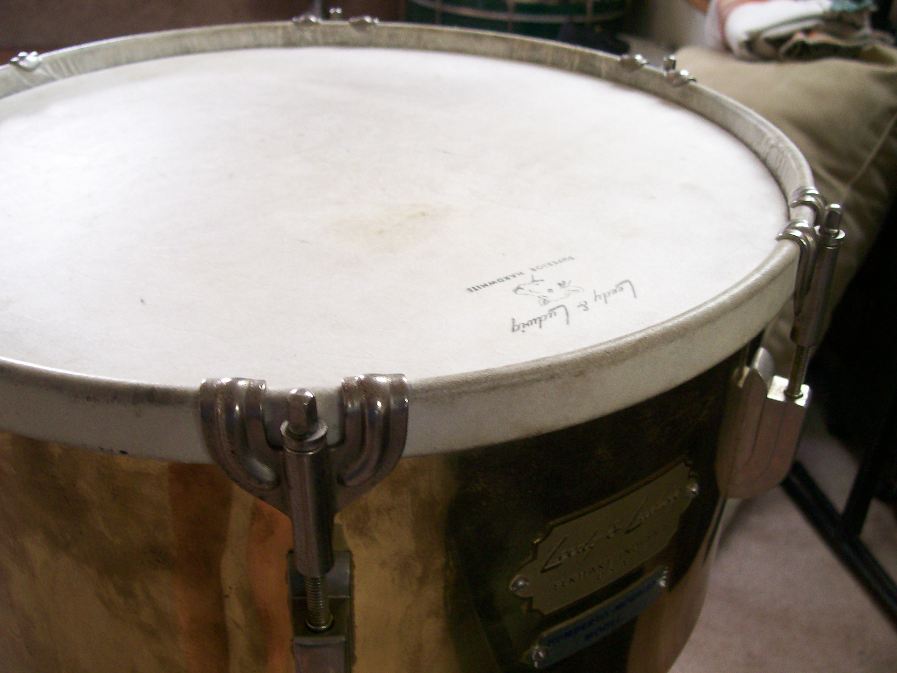 I'm sorry to confess that on the Leedys that I had bought from you, I took off the animal skins. The macho was just finished. I couldn't tune it up anymore. First of all, the rim was out of round, which - I hope - was caused in the transport, and the drum itself isn't perfectly round anymore, either. In addition, in the older days the drums tended to be wider, so the skins were less floating than today. Now, if the skin hoop is attached closer to the drum shell, when you tune the drum, you actually stretch more the part of the head down below the edge than the playing surface.
