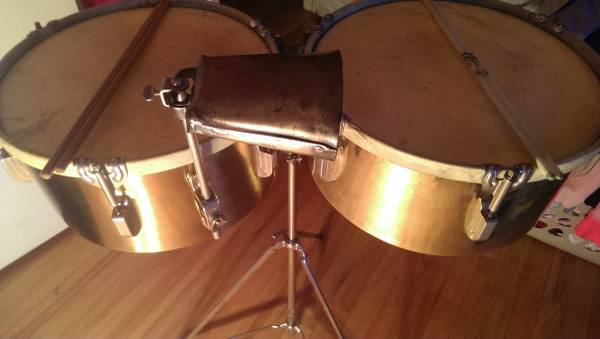 These are Leedy timbales, but probably from the era when Leedy belonged to the Slingerland company. I own a set like these, but mine have Leedy badges. Classic 13" and 14" brass shells and animal, probably calf, skins, traditionally wrapped around the rim.