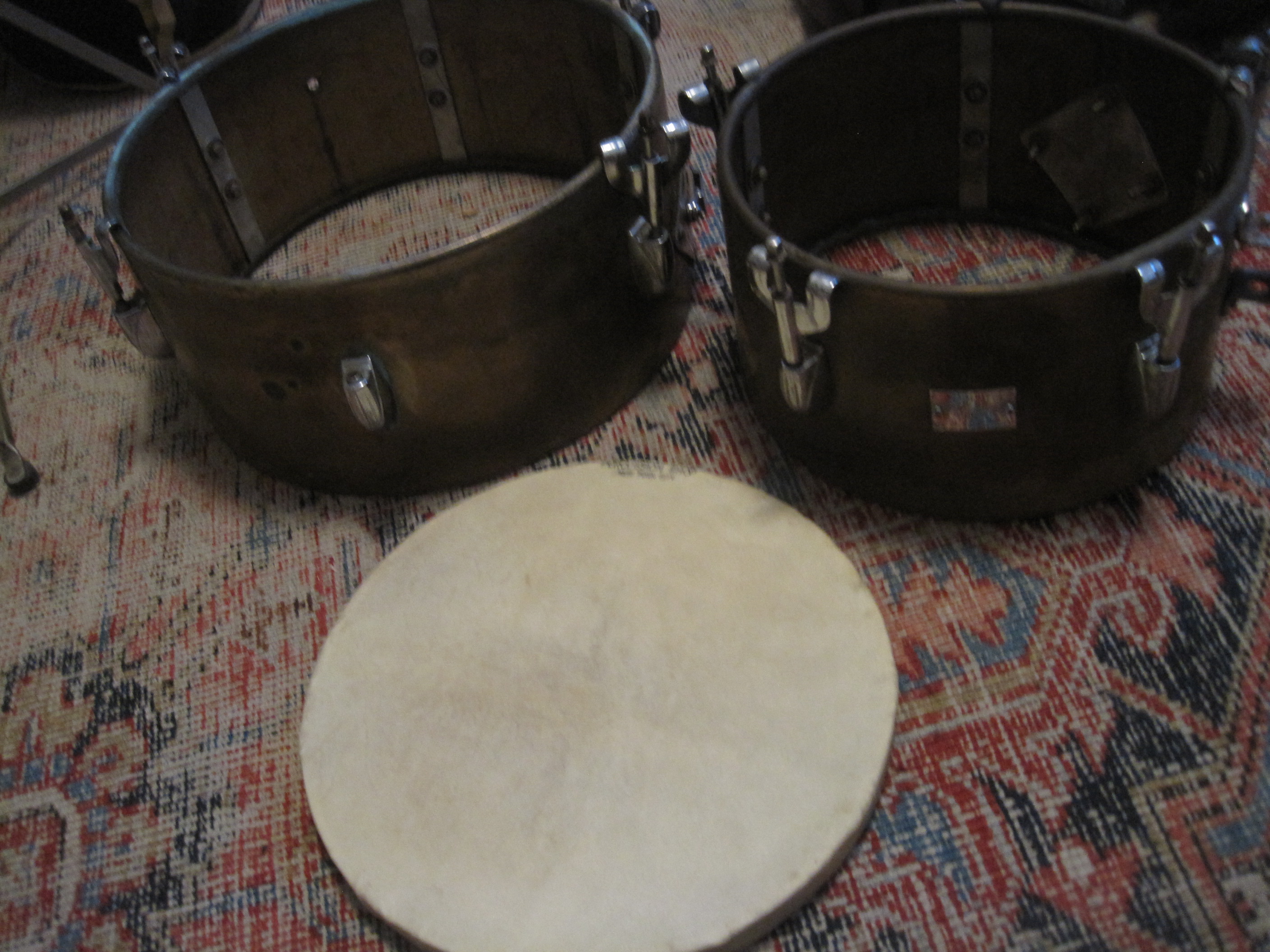 I have two Gretsch timbales I'd like to sell - they're "Henry Adler" vintage timbales - appear to brass...and some of the brass looks pretty rough - I tried to clean it up a little - can send picture on request. One drum does not have a head, the smaller has a new head still in the box. I wonder if it's possible to get replacements for these heads? This looks like it's from the 50's or something. Forgive me for my ignorance - I wondered if anyone here would be interested in these timbales in their given condition - the hardware has a fair amount of rust as well. Please email me: jds622@gmail.com and I'll be happy to send pictures. If anyone has an idea what they might be worth (in not-amazing condition missing 1 head) - that would be helpful too! THANKS!