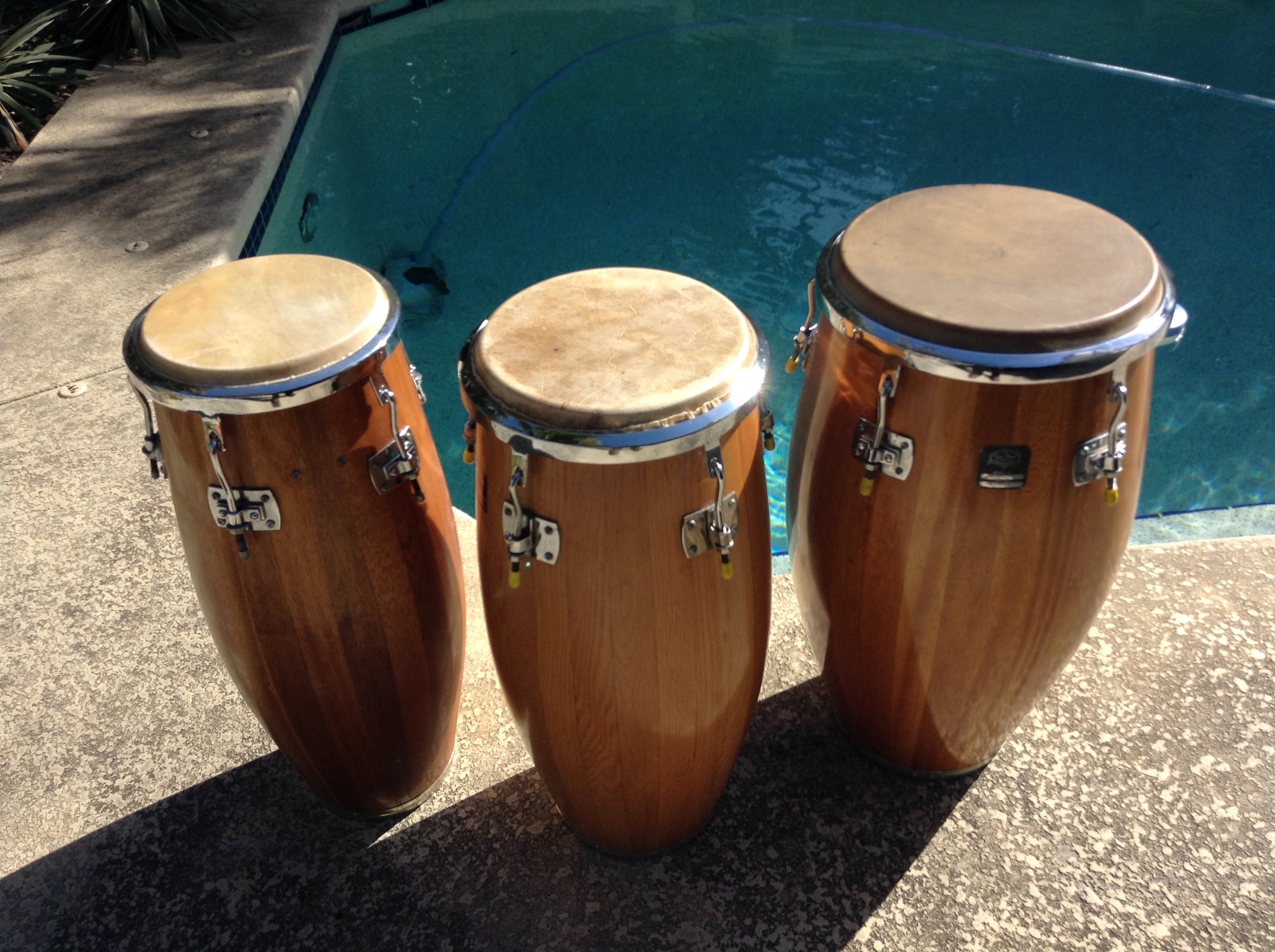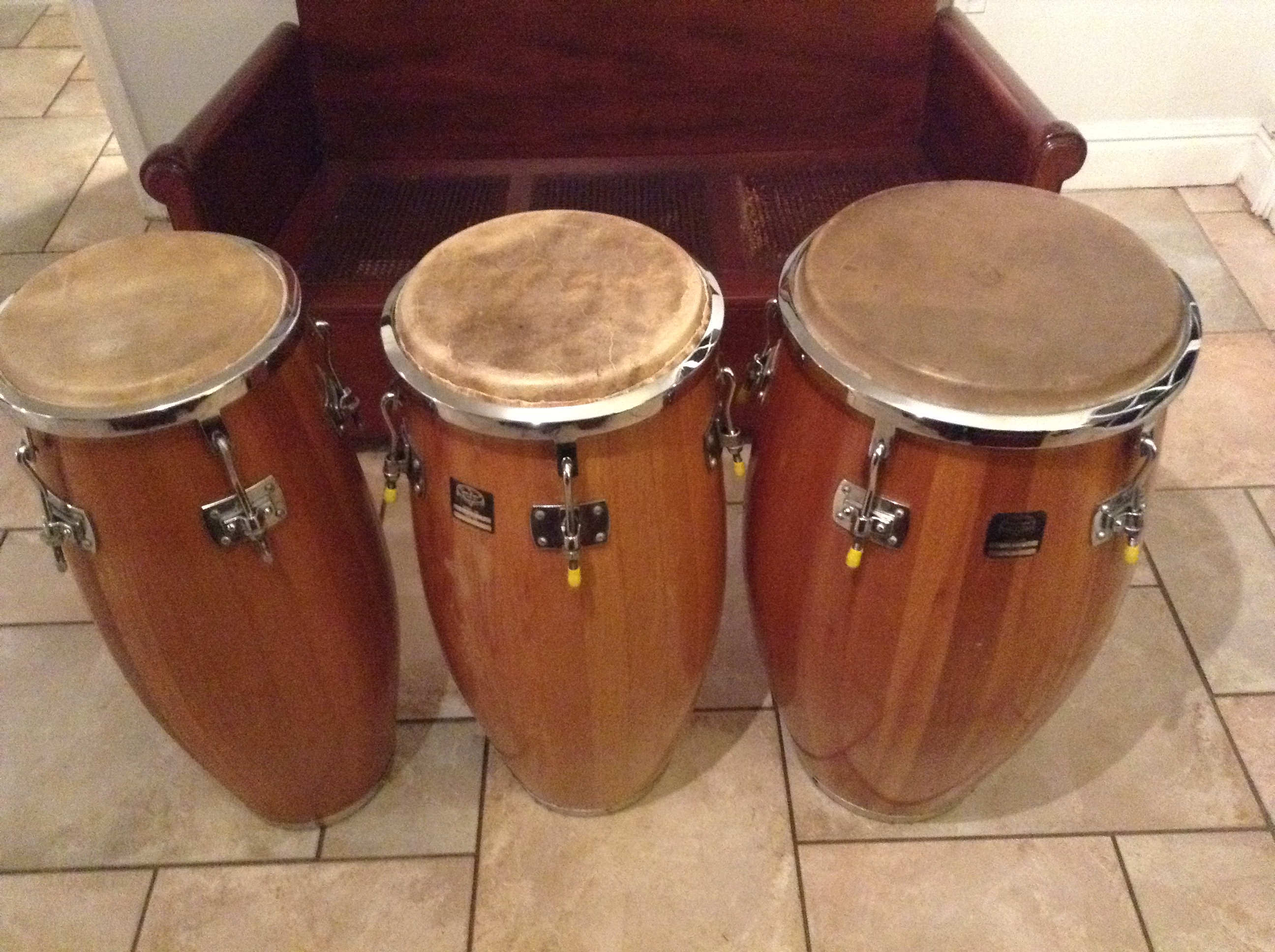 Vintage Gon Bops Deluxe Teardrop model from 1976. Gon Bops most expensive model, wood with fiberglass coating.Quinto, Large Conga, Super Tumba (IQ 4141,ICL 4141, ITXL 4141)Excellent condition. 4 SALE OR TRADE. Trying to cut down, will trade for 2 Skin on Skin or J. Tirados or sale for $1,300. Awesome very melodic sounding congas. Made in America.
