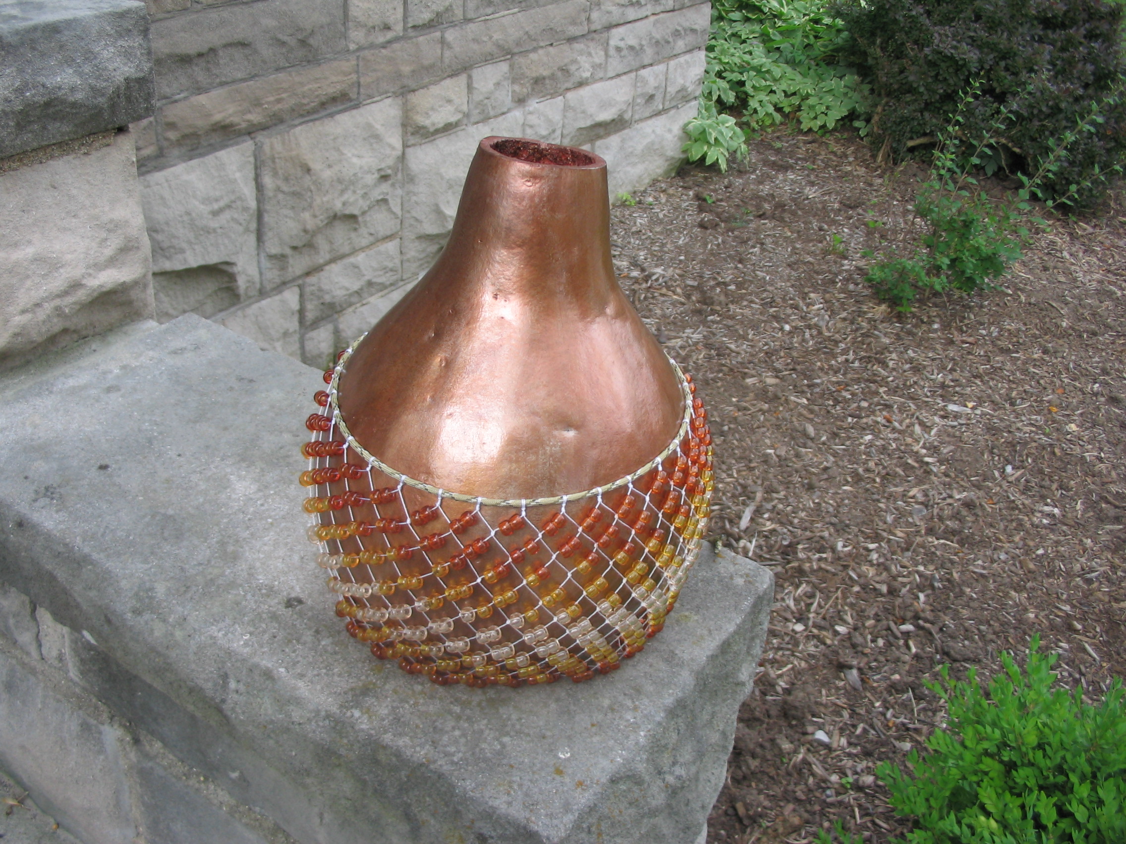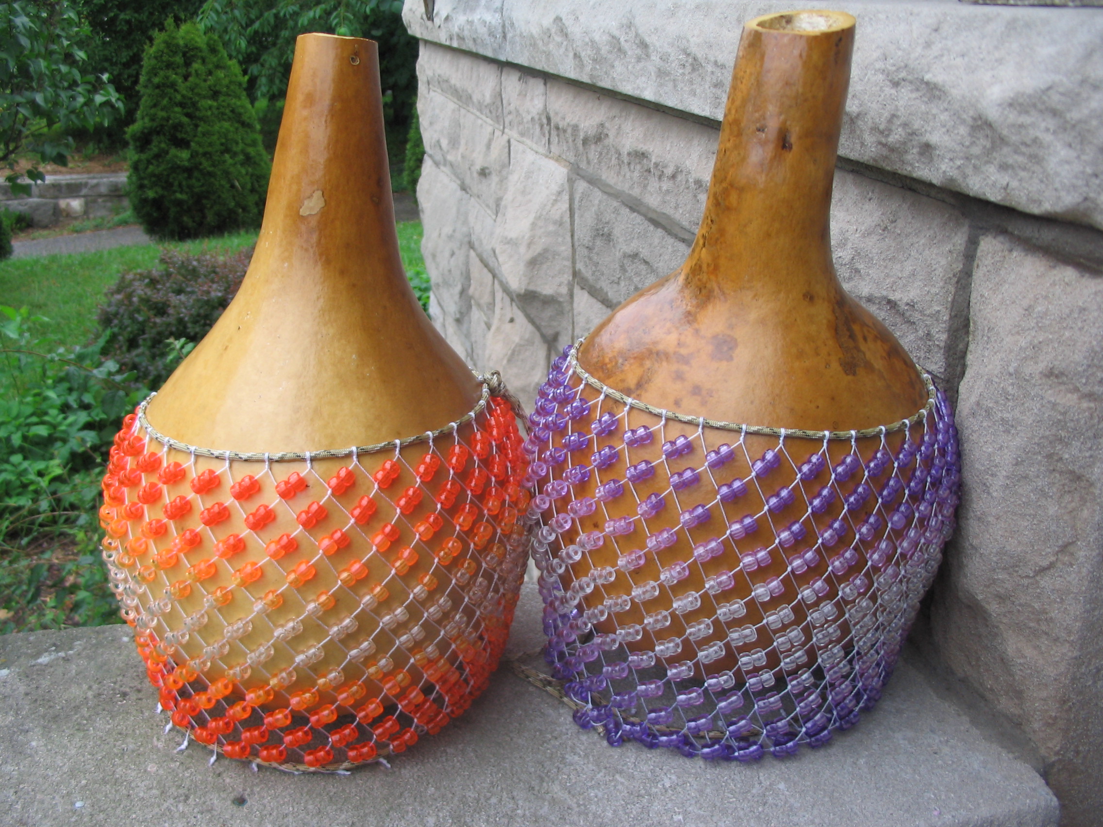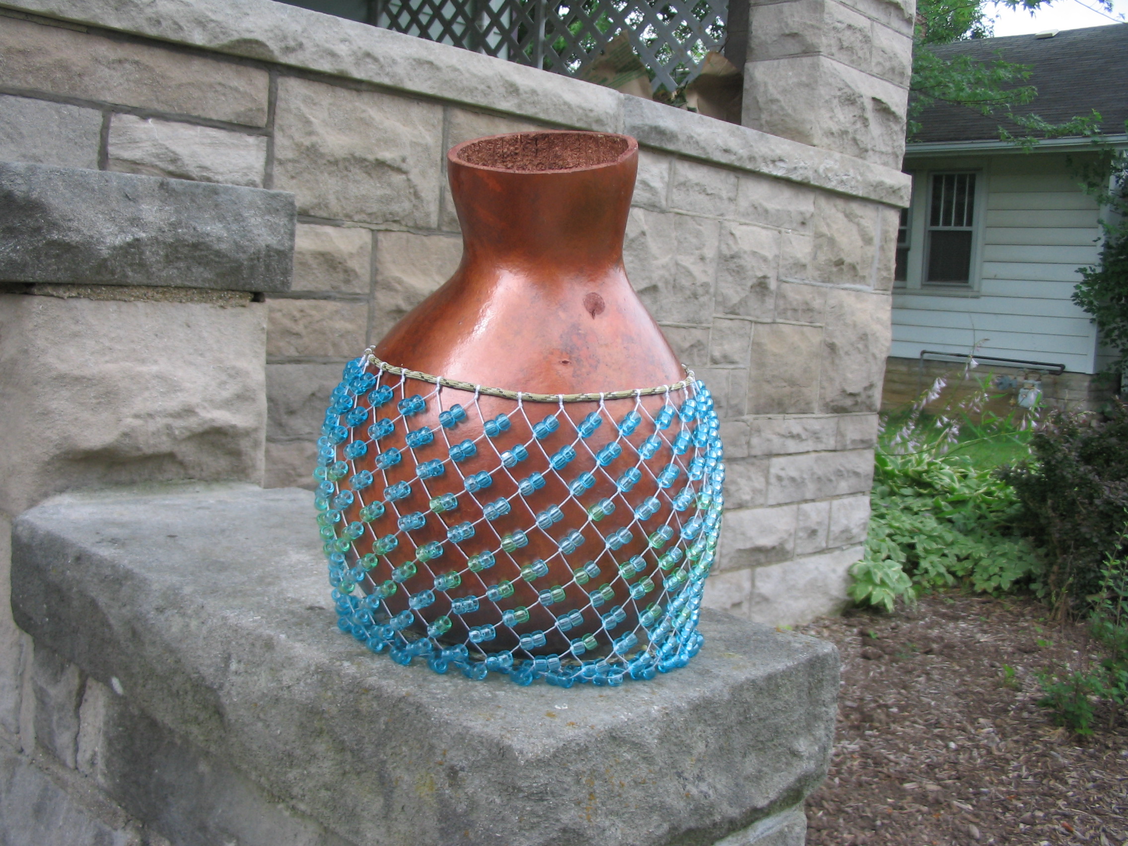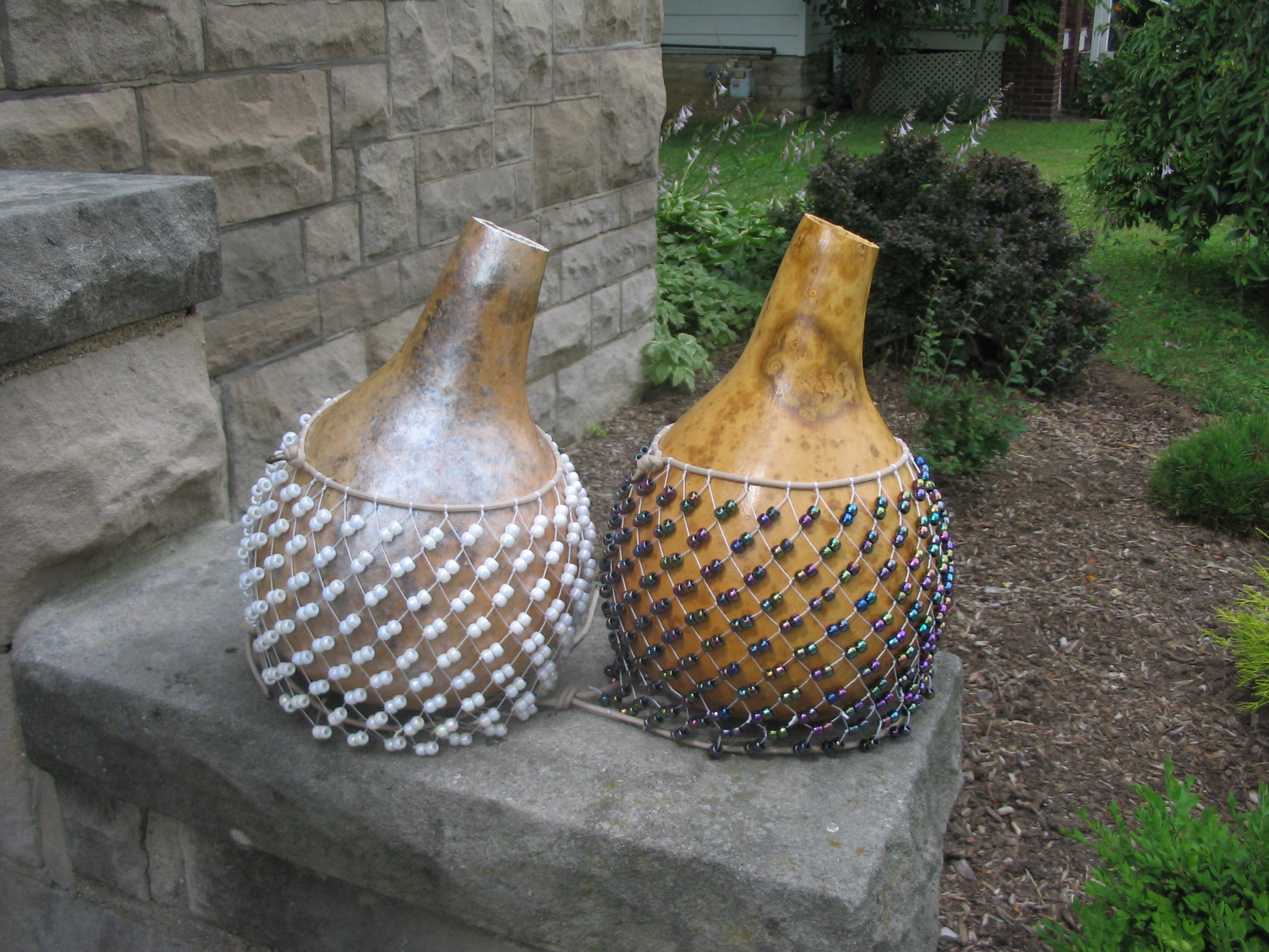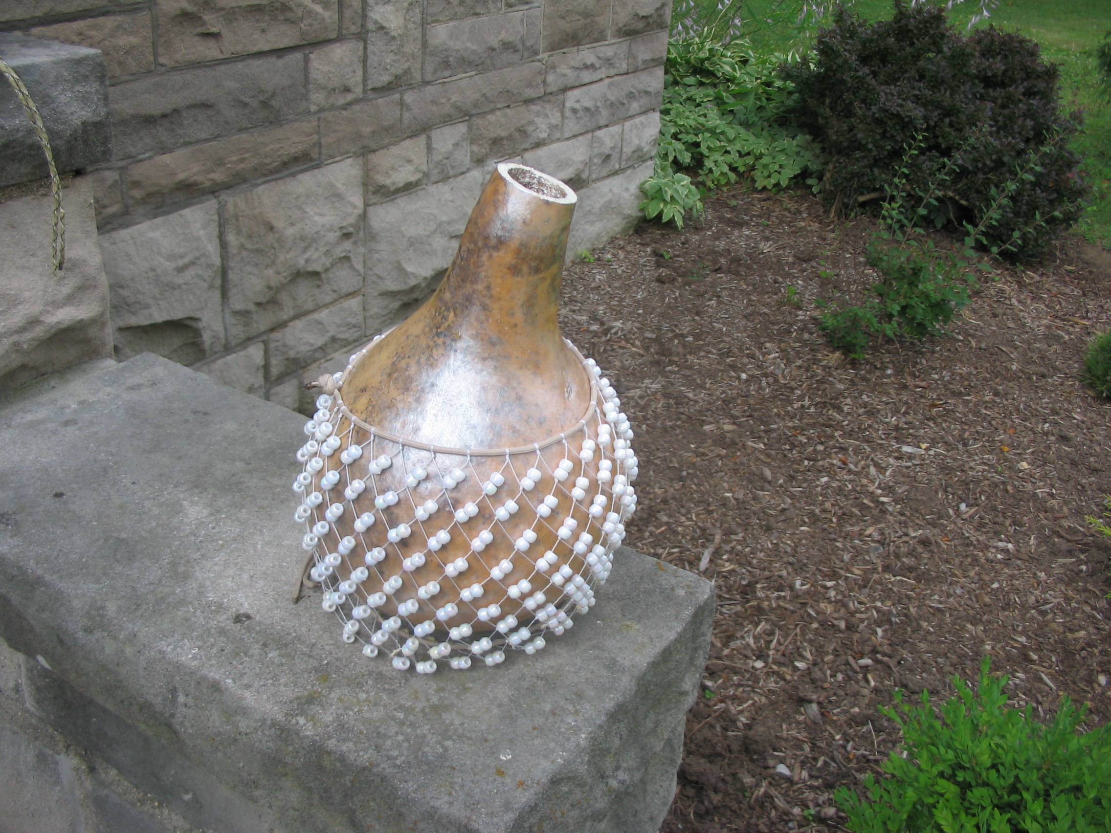 Solid gourd with natural finish and polyurethane. About 10" diameter and 13"-14" tall: 25 leads, 12 rows with 54 beads / row totaling 648.