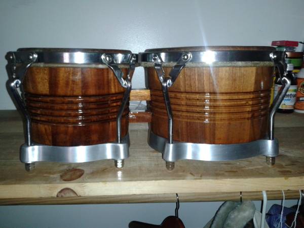 Rare vintage Walnut Palisades Park Bongo, hardware & shells in mint condition, macho has a new meinl skin , hembra has a Bill Confer Steer hide.