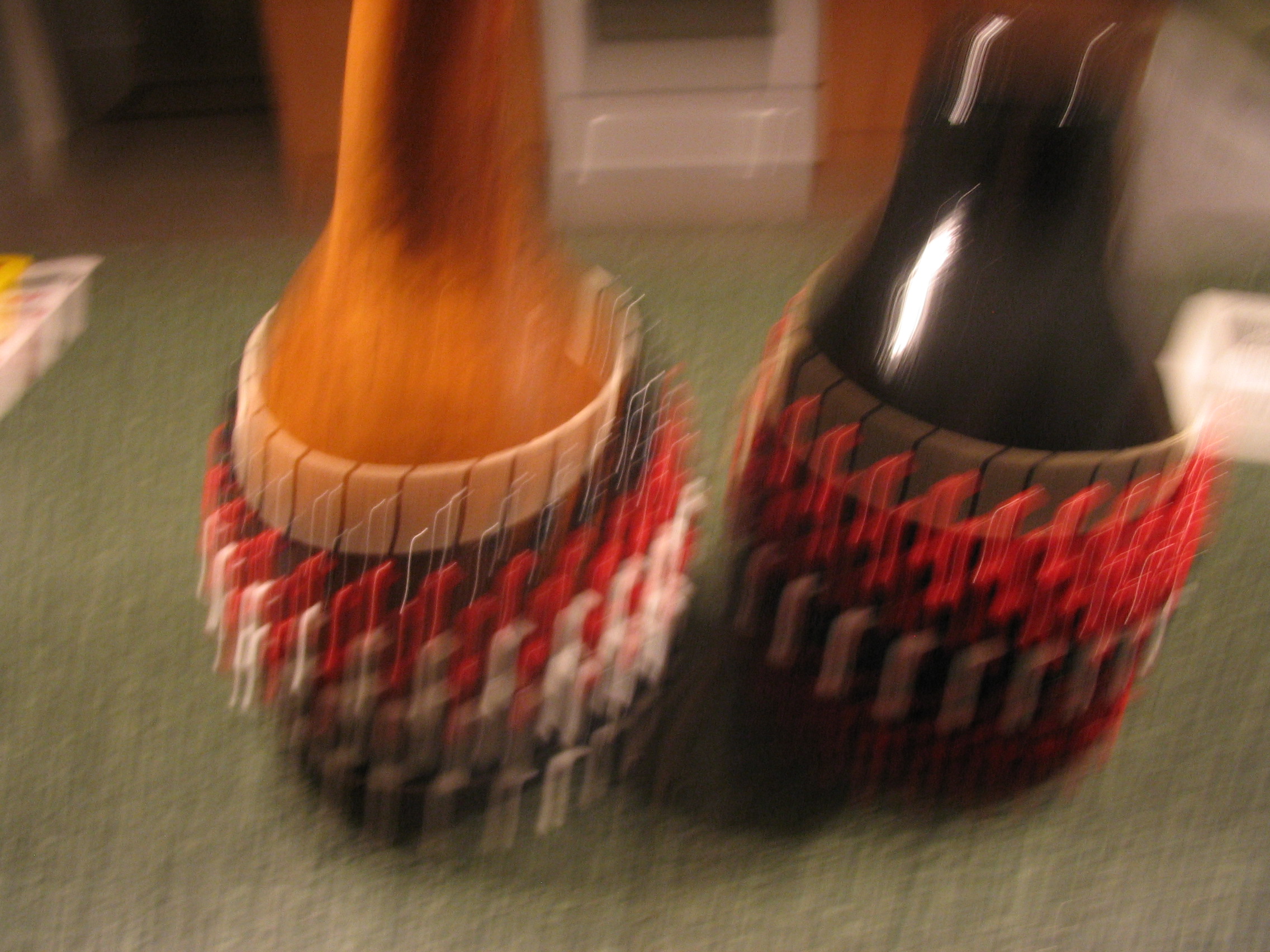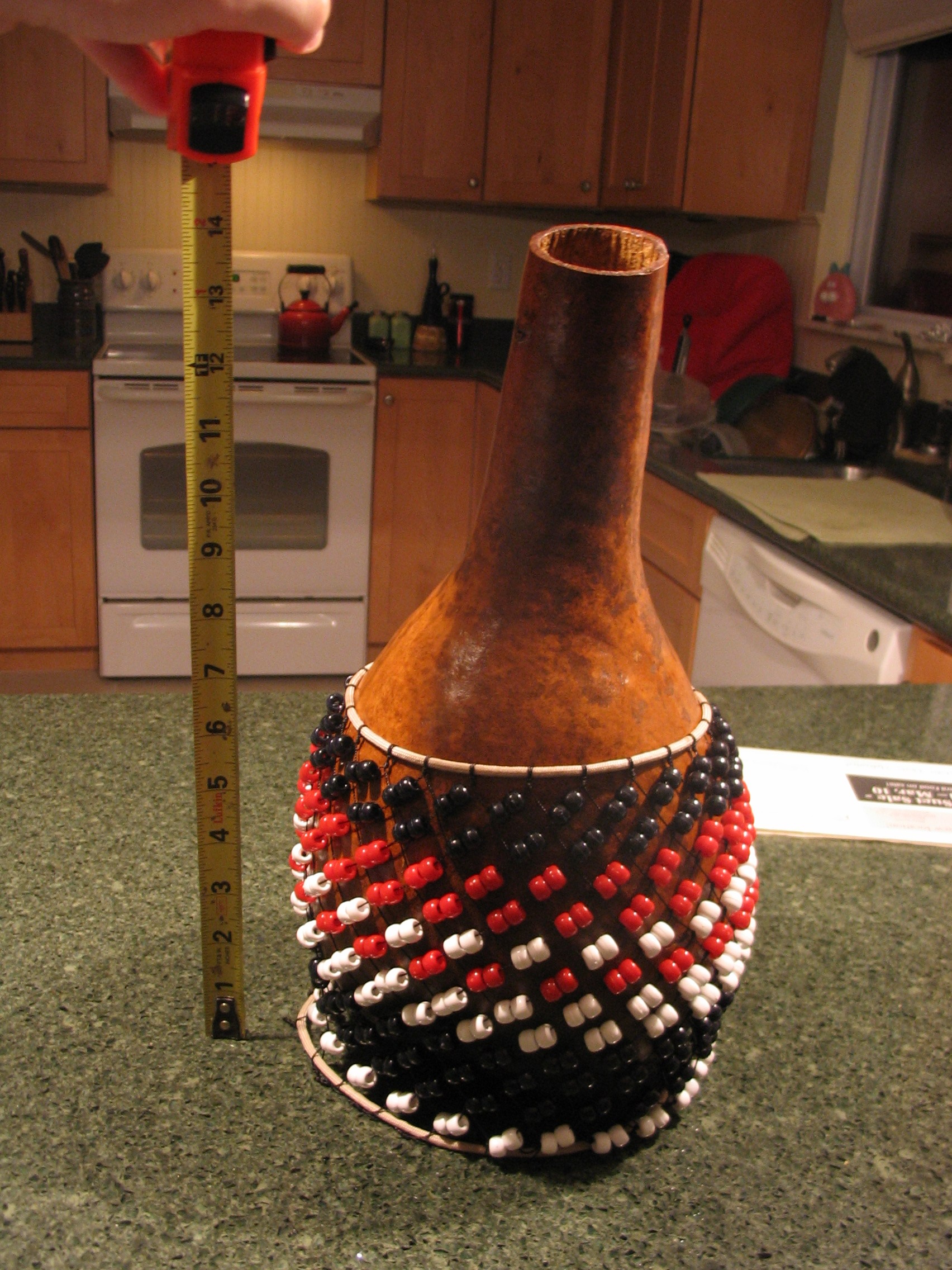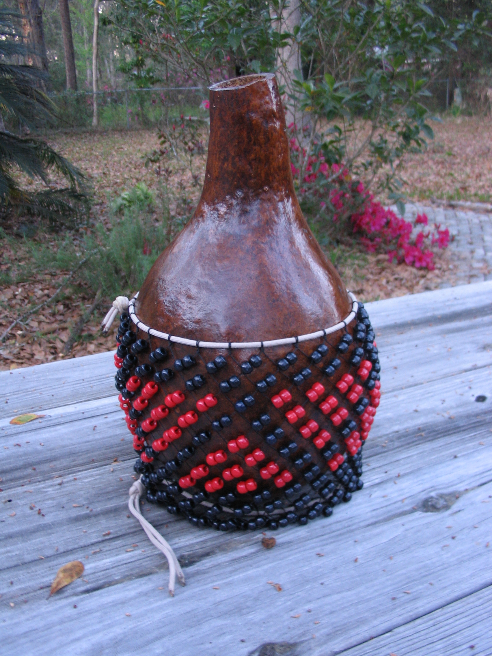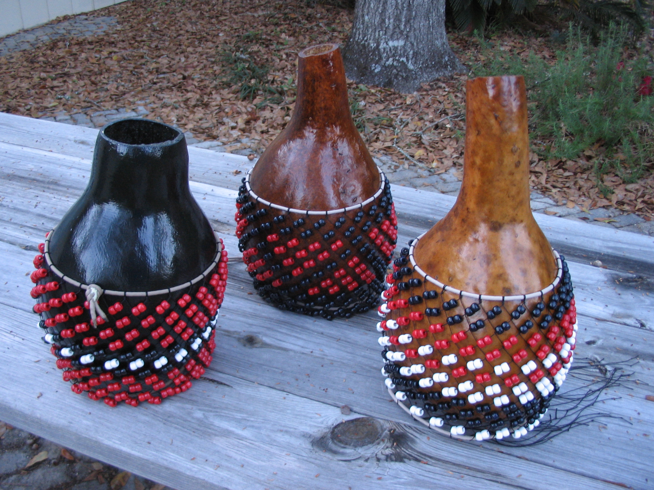 Greetings everyone!!! Well, I'm back to posting shekeres after a flurry of custom orders. This batch represents a different direction from my signature fades and blends. Red, black, and white go well together and create bold eye-catching contrasts so I wanted to create some simple, effective, streamlined designs. These gourds range from 12" - 14" tall and each one is 8" in diameter. My standard rate for these sizes is $45 shpped to forumites in CONUSA.  I will combine shipping in case of multiple orders.  International customers please contact me separately about shipping options.