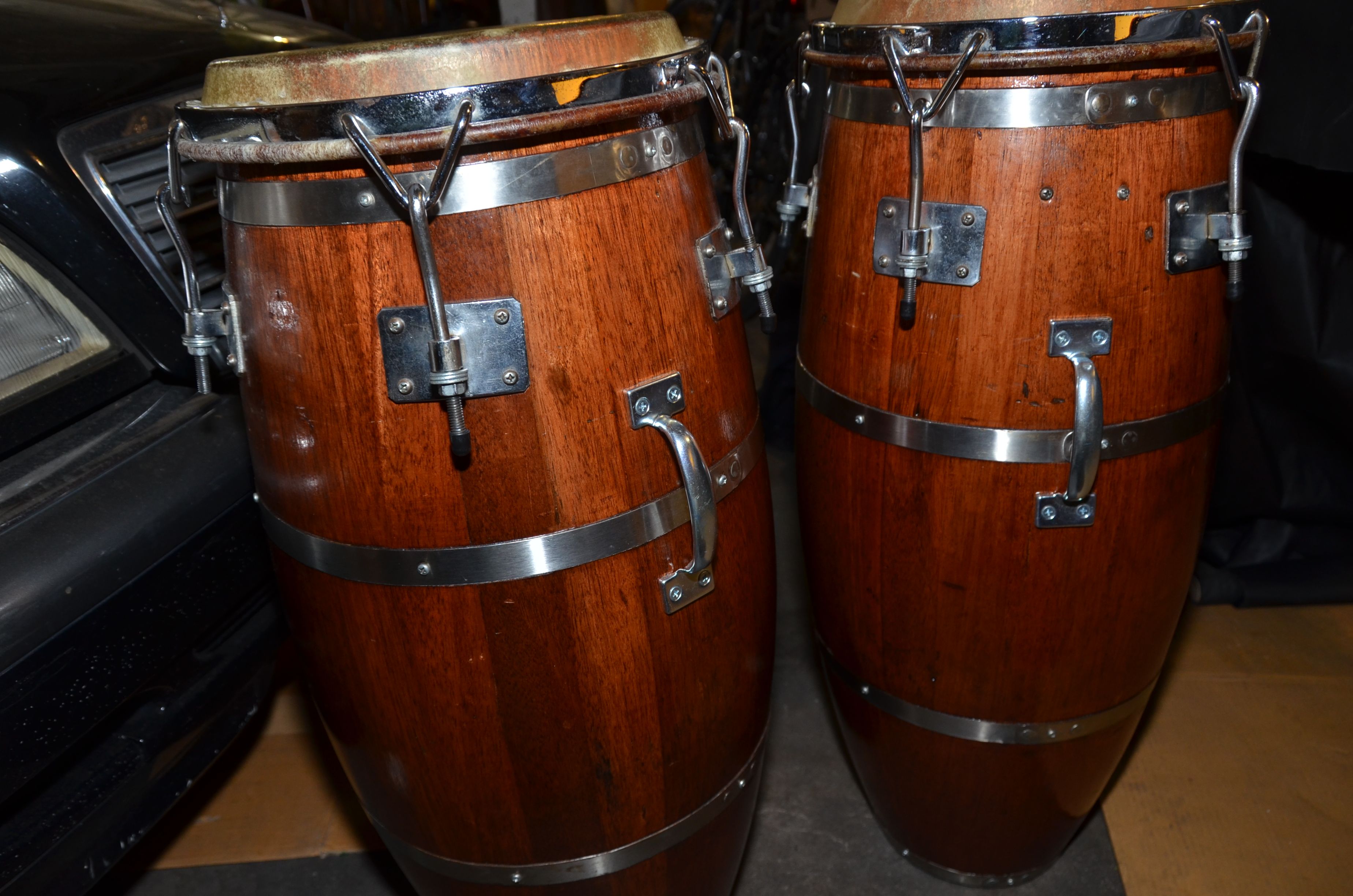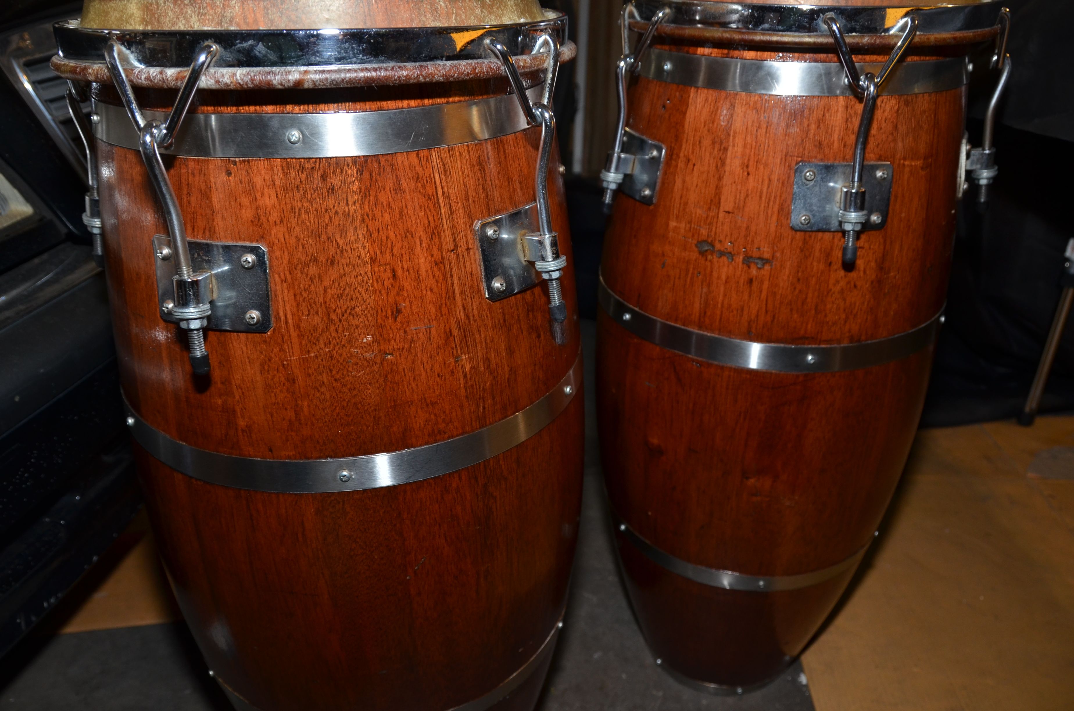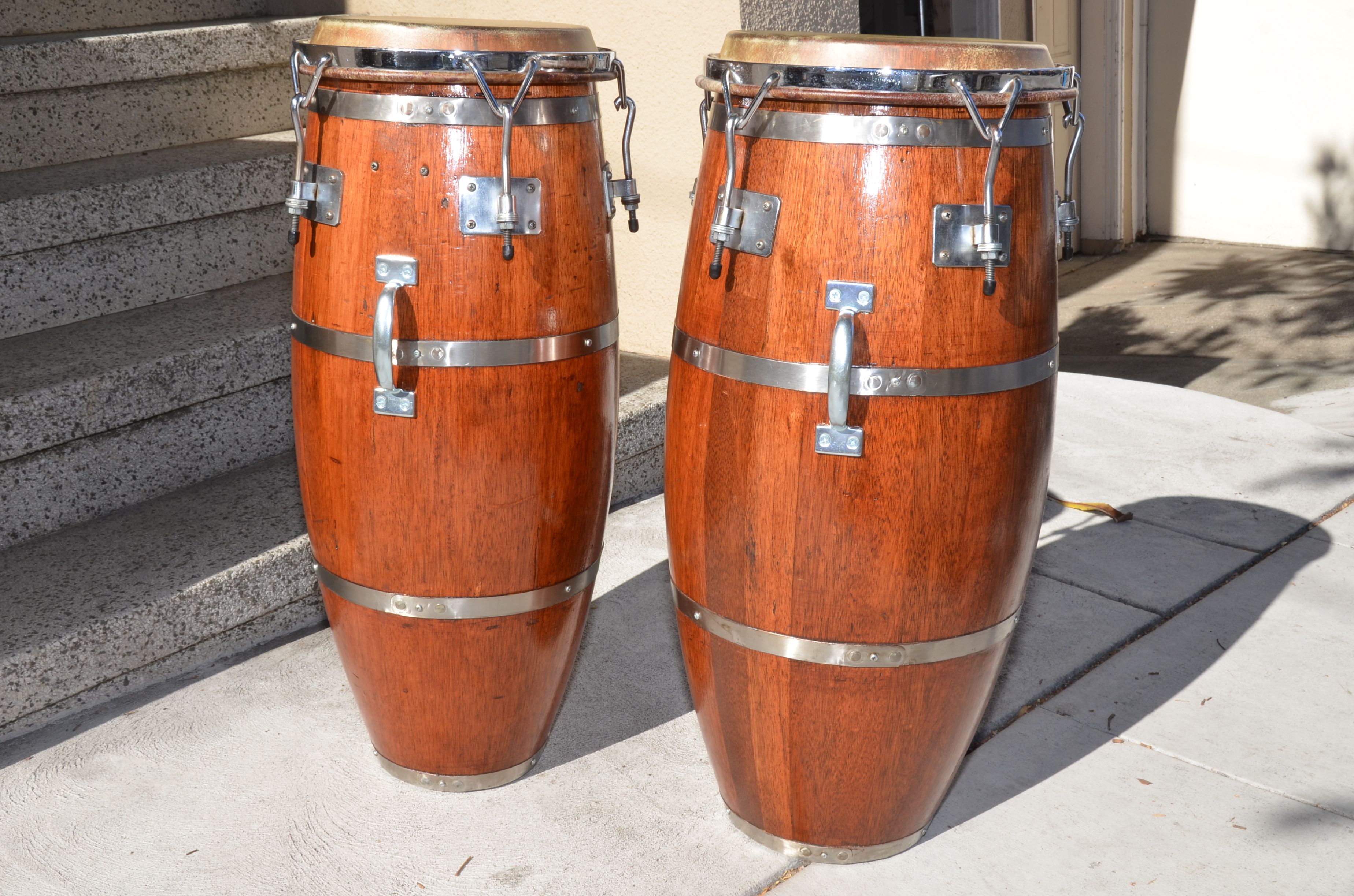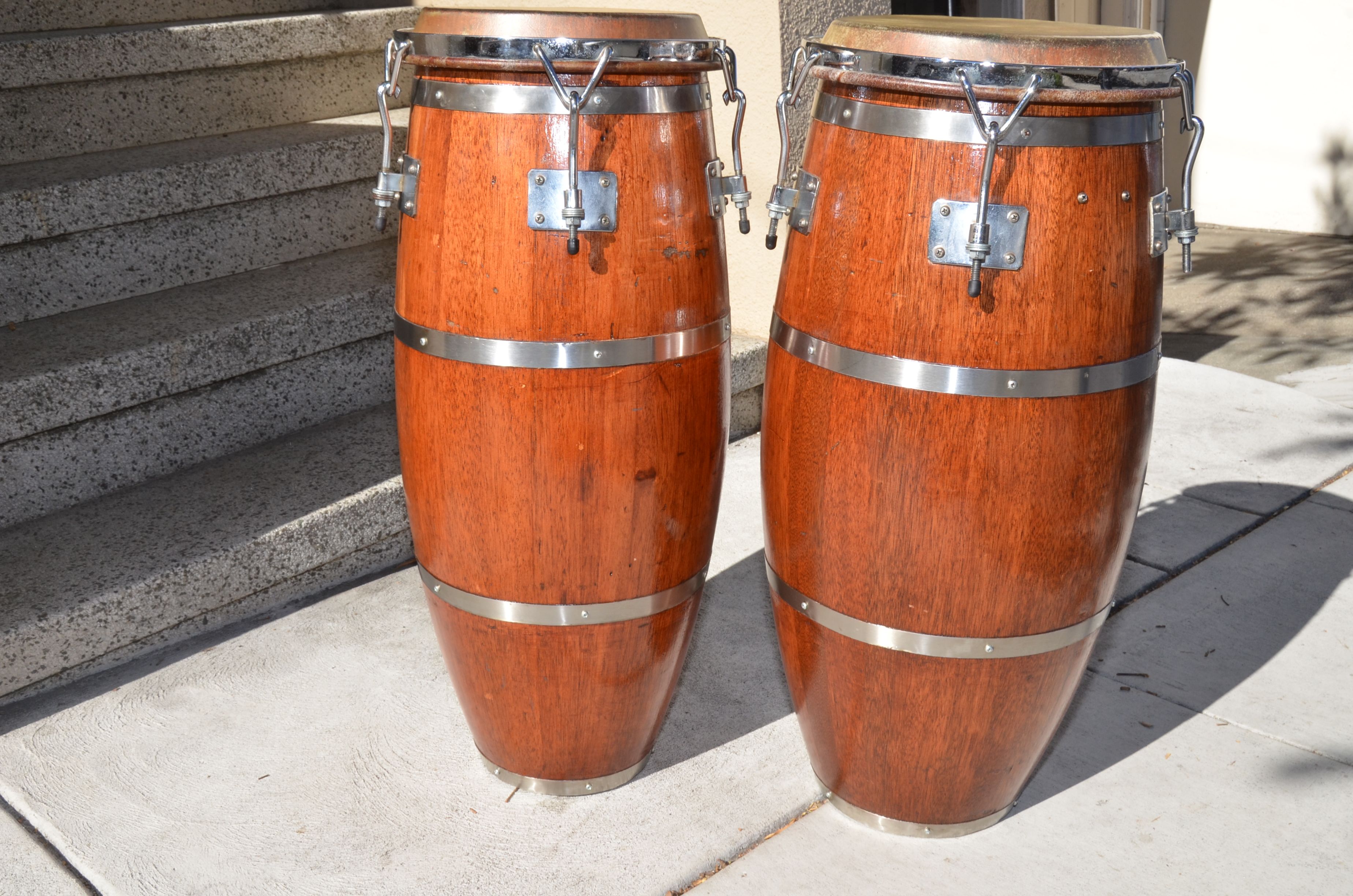 These beauties are still in round due to the effort some past owner went to in placing an iron ring inside each drum (Áro in Spanish) after market. I have owned them for 15 years and bought them used. New heads about 6 months ago. Some scratches from use as you can see from the photos. They are as light as a feather and make perfect Rumba drums. They sound amazing and have a unique character all their own. Sorry to have to part with them.