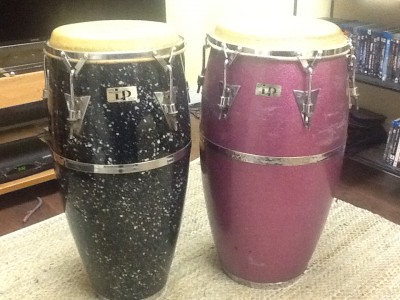 Collectors' Items for sale: LP Palisades Park era Original model quinto and tumba. The tumba's been around the block, and both would sound even better with new skins. Tumba (purple glitter) has paper label and is probably late '60s. Quinto (black with Mother Of Pearl inlays) has metal badge...early '70s? I would like $380 for the pair. I would be open to some sort of trade deal for a nice set of bata.