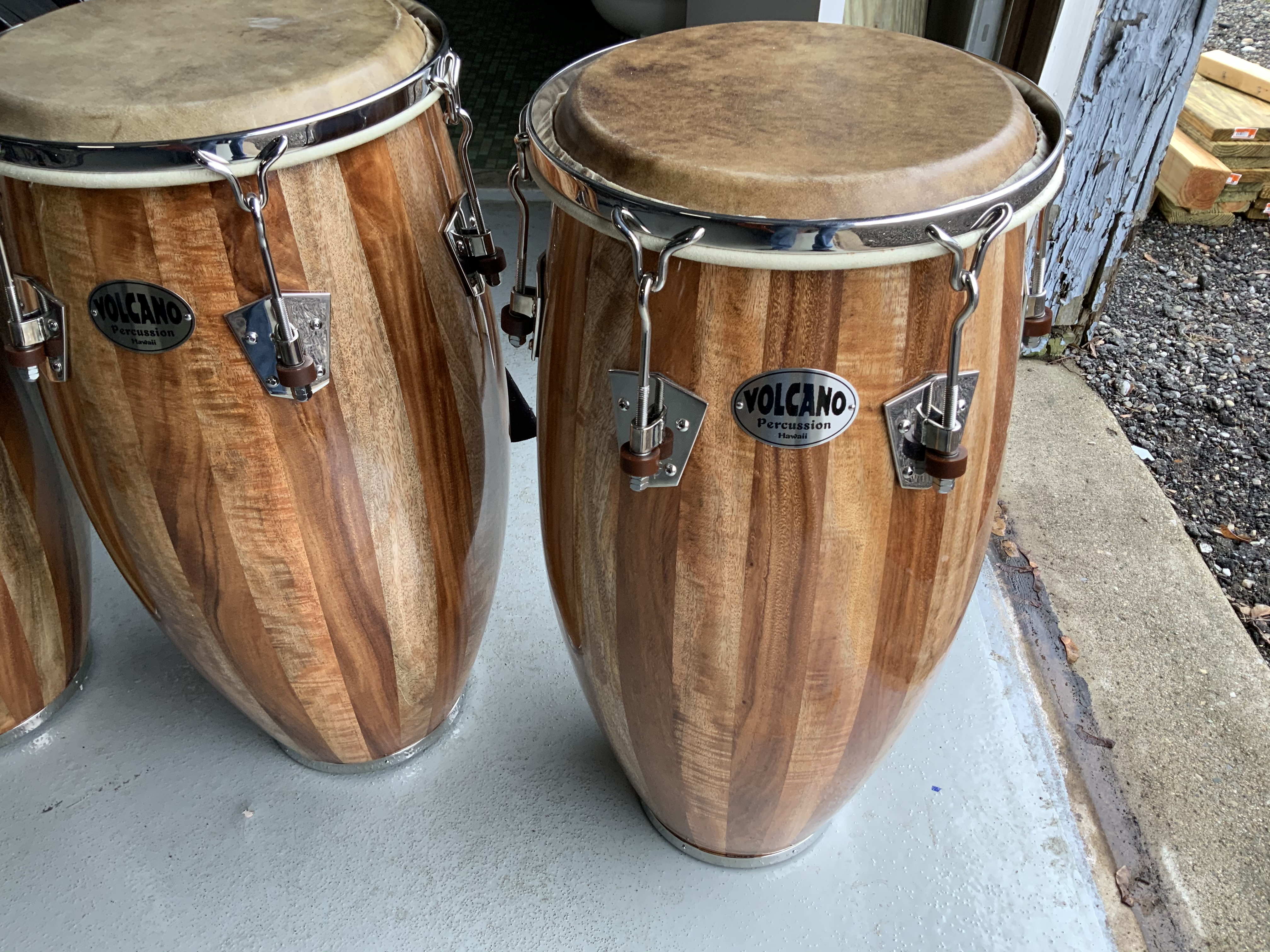 Volcano Percussion congas made from a Monkey Pod/Mango exotic wood combination.