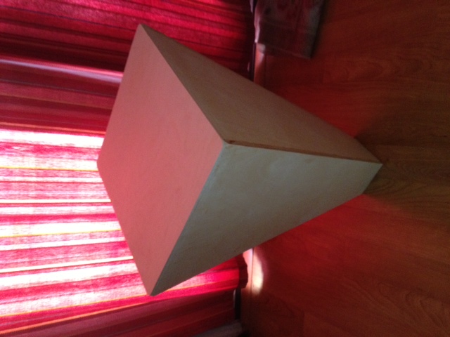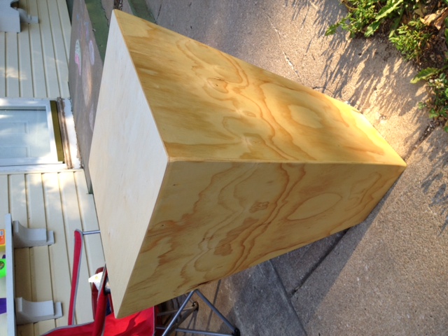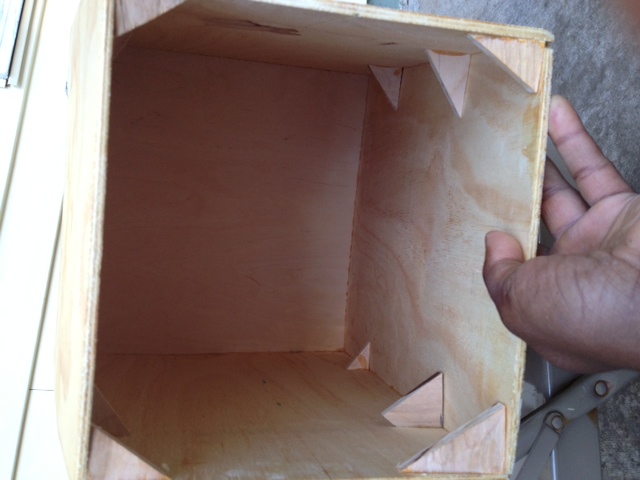 The first picture is the first attempt; the sides are 1/4" pine plywood, and the top is 1/8" birch, with a width of about 19" x 19". The drum itself is 29" tall. One thing i noticed is the walls absorbed too much of the bass tone, so when i played it slightly tilted to let the sound come out, the sound was rather weak. When i turned it sideways and played it, the bass tone was beautiful! However, the sustain was rather short, as Birch has a more punchy bass tone (I dont know how fat conga got those smaller segundo cajons to make so much bass with great sustain because they used birch wood as well). When i tried it out at the rumba, maestro Agustin told me that the sides needed to be thicker and the hole smaller. I also chose to use a hand rubbed varnish and coated it 3 times. Sold it to some lady for $100 and it costs $40 to make. Also because I cant make 45 degree cuts yet until i get a new saw, i had to add some reinforcements to the inside as you can see.