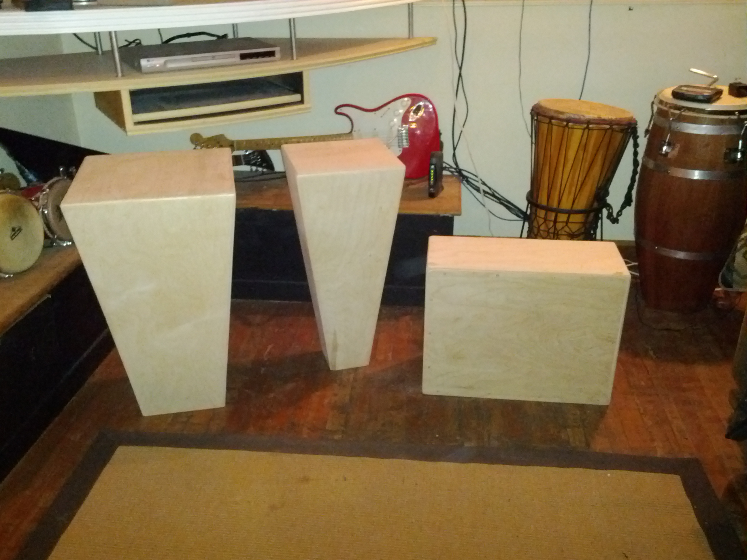 This thread inspired me,thanks to Oscar (p.a.dogs)for the plans for the conga cajons,the bajo is the same size as the Pancho Quinto one that danno posted,it has really nice tight bass tones. I put a 4" hole in the back instead of the 2.5" square one on the side.The congas are great too, one is 16" the other 12".