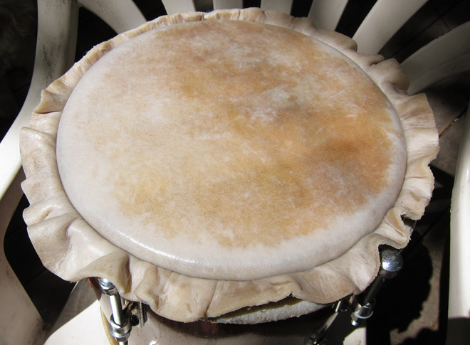 The thin side is traditionally goat, or sometimes two layers