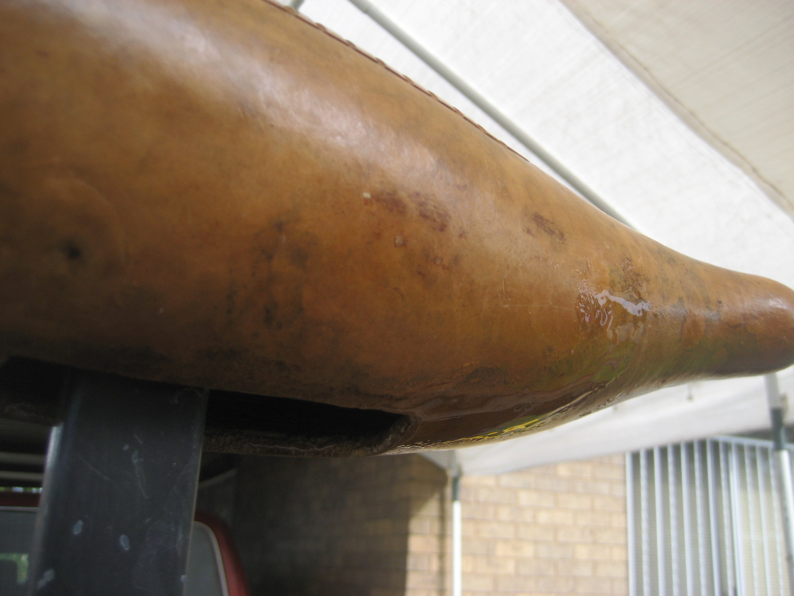 Gourd 1 rear. Epoxy dries rubber like, soft to touch, yet very firm & flexible bond. Super hard wood glue underneathe.