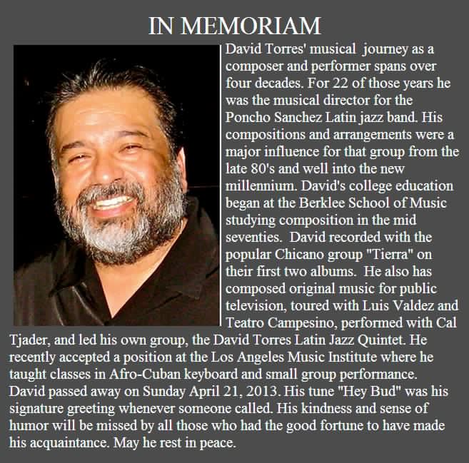 I regret to announce the passing of a great musician and composer David Torrez. I had the privilege to see him perform with the Poncho Sanchez band, his solos were second to none. RIP my friend.