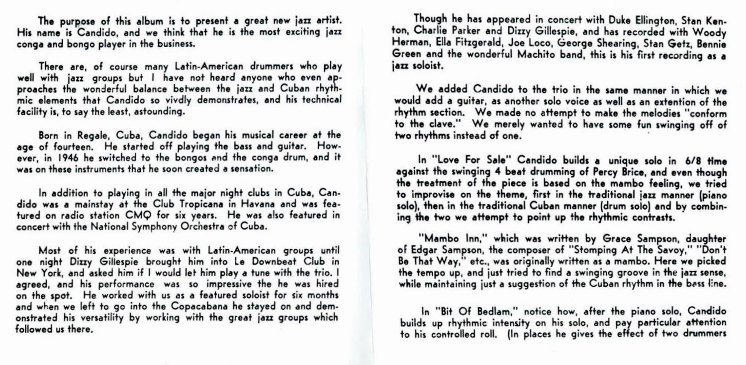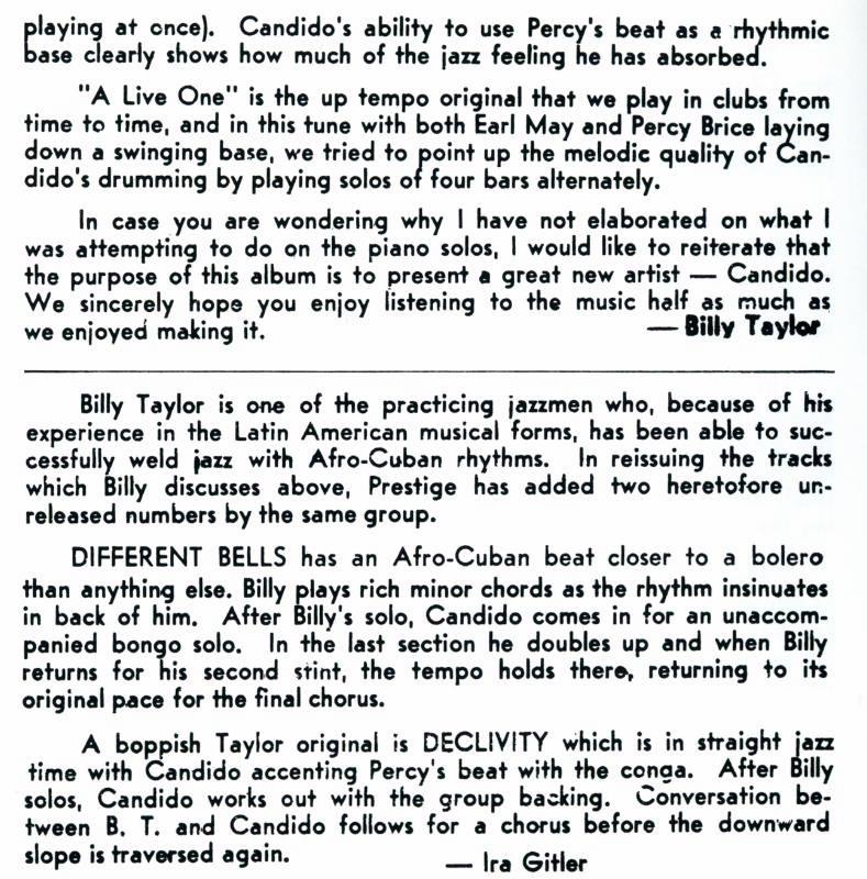 http://www.amazon.com/Candido-featuring ... 170&sr=8-5Candido's first as a leader in 1955. It features a killer band of Al Cohen on tenor, Whitey Mitchell on acoustic bass, Joe Puma on guitar, Dick Katz on piano, and Ted Sommers (who played on a lot of the RCA Puente sessions in the 50's) on drums. Required, required, required, listening."