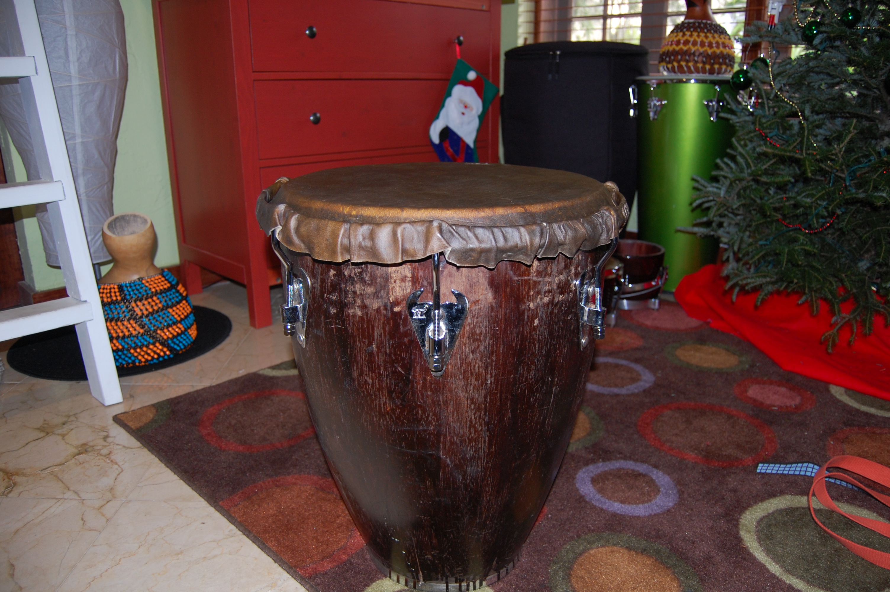 This is my attempt at making a 'bomba-sounding' drum. Its an old matador tumba that had started to warp at the top so I cut the upper half off and re-installed hardware (had to add another plate & hook-making it 7 in total). Buffalo skin. The head is 15.5" and it's 21.5" tall.