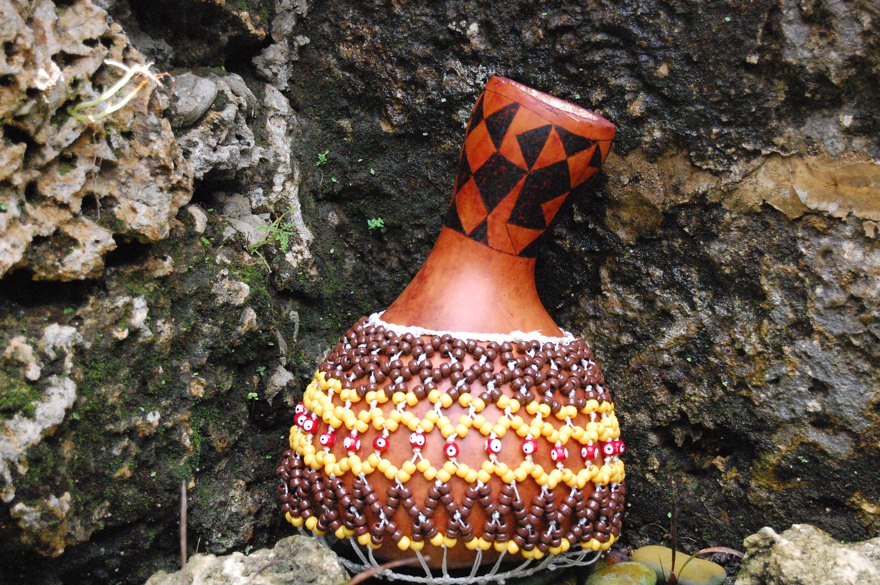 Guiros: the upright is from a tropical gourd and the resting is from a upstate NY "goose neck" gourd