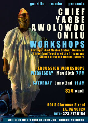 Los Angeles Afro-Cuban Song and Drumming Workshops with Chief Yagbe Awolowo Onilu Visiting from San Francisco, California, Chief Yagbe Awolowo Onilu will teach two Afro-Cuban song and drum workshops starting on May 30th, 2012 at Troy Parker’s space in Los Angeles.