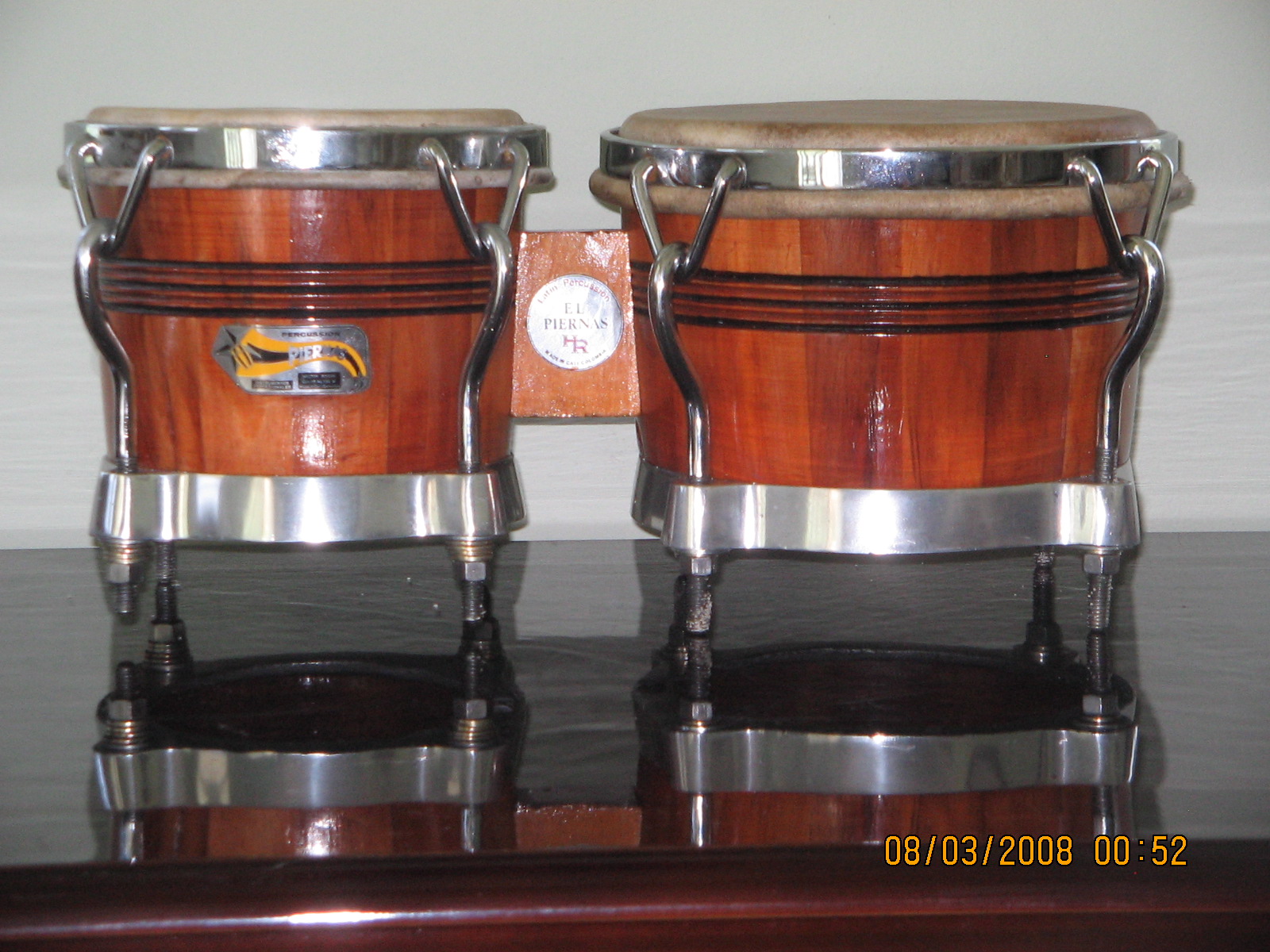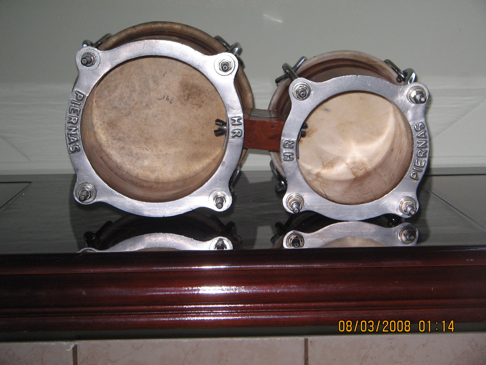 An incredible sounding bongo'. To this day I don't know what kind of wood it is, I don't think is caoba, it must be a hard precious wood from Colombia, when I had it a Colombian bongocero from Joe Arroyo told me it was "palo santo". Is always good to have and pass on, I'm glad someone who appreciates top of the line quality has it. When it comes to sound that particular vintage El Piernas refuses to take a back seat, its a bit heavy though, but once you get use to it is no problem. Is good to see the old champ again. I think the hembra still has the "mula" head I put on it. Circa very early 1980's. Here is a photo of when I had it.