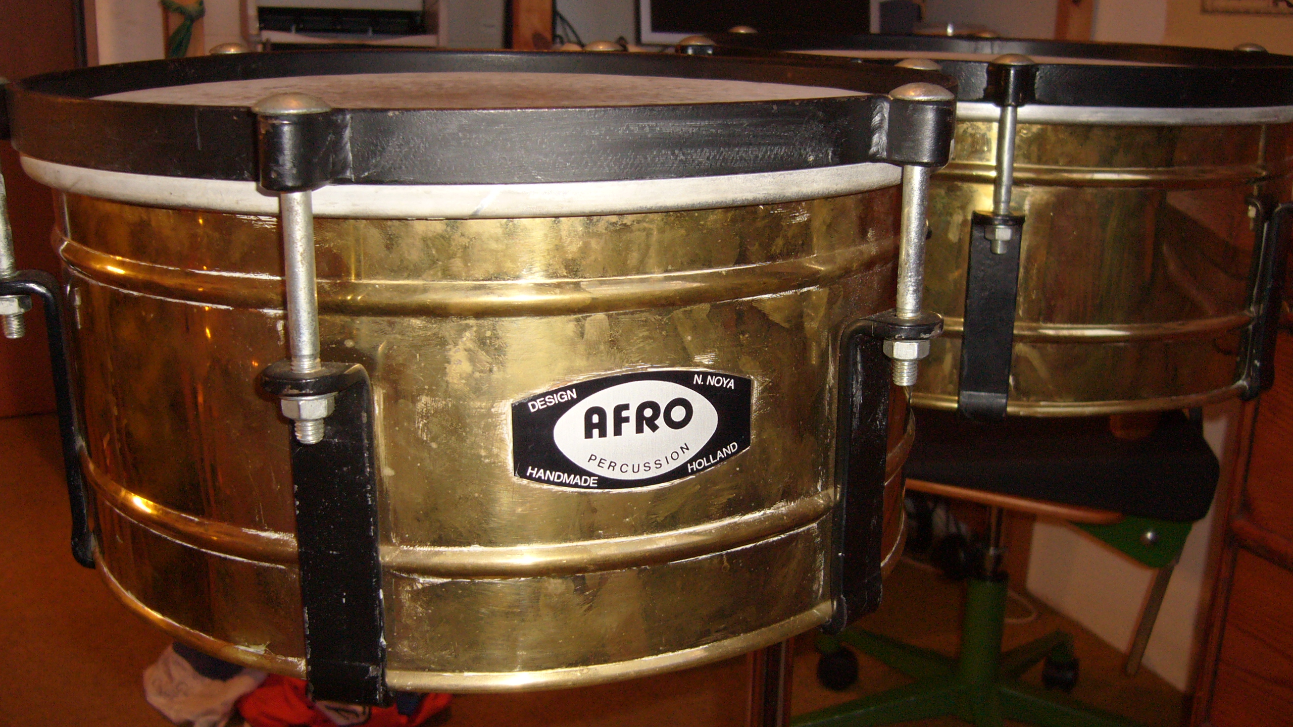 Here is a pic of my brass AFRO timbales - note the old badge, later they changed the design: