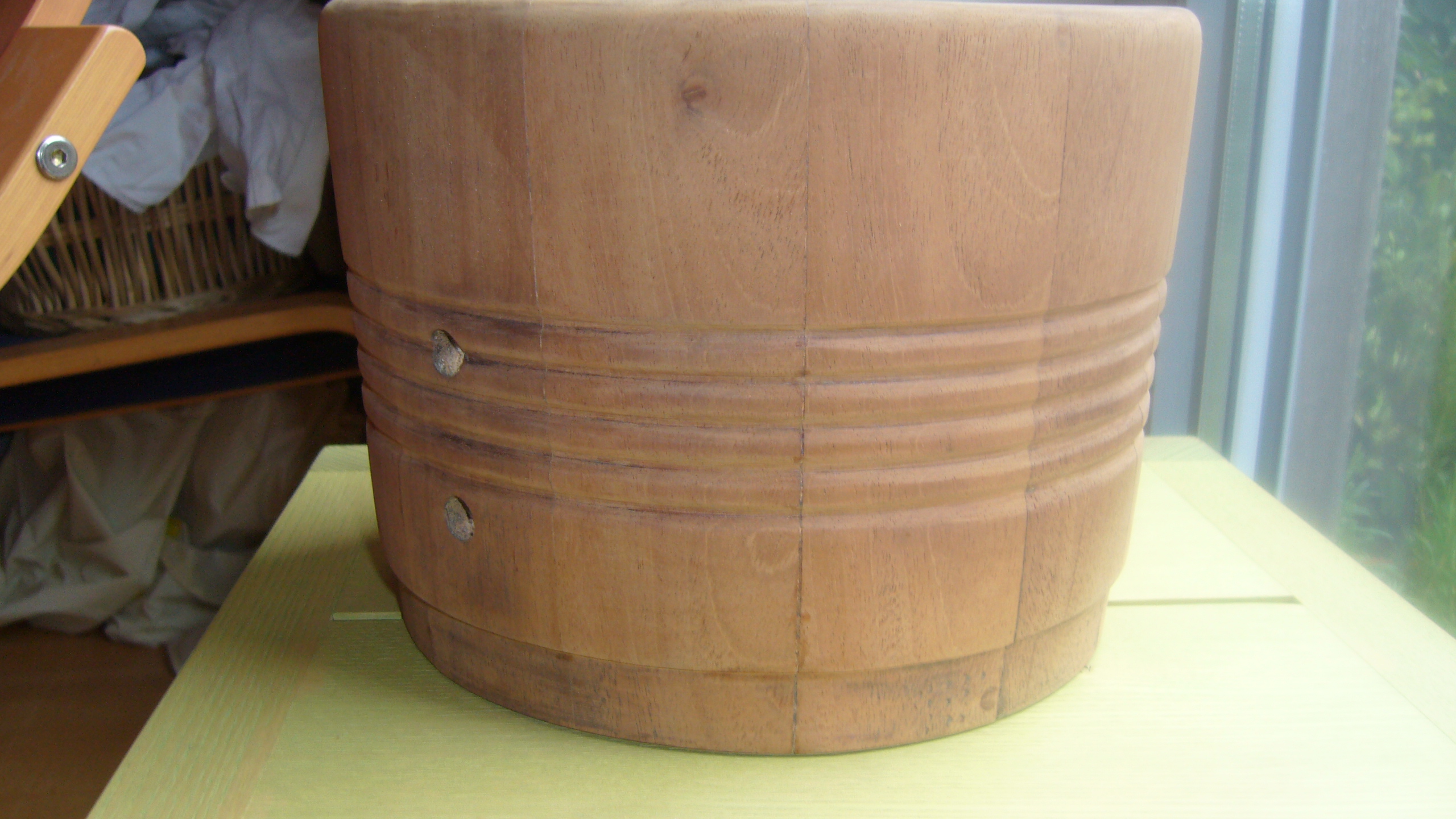 did was to get rid-off that top layer of nasty stuff. To me it was put on the drum to disguise problem areas, an easy way out. Is not varnish for sure. Underneath that crap I found original finish that was never stripped or sanded down. Once I stripped and sanded down everything I found problem areas. The seams between the staves were coming apart, I reglued them to best of my abilities. Mine did not fell apart like that. I am glad I restored and refinished this LP beauty, I do have another one exactly like yours in mahogany that I restored and refinished too. One thing that I do when I buy a used bongo or conga that has some years on it and has been put through the paces is that strip them down to the bare wood and I do a visual and manual structural inspection. I am quite sure you will get your beauty it back together again. Best Of Lucks!