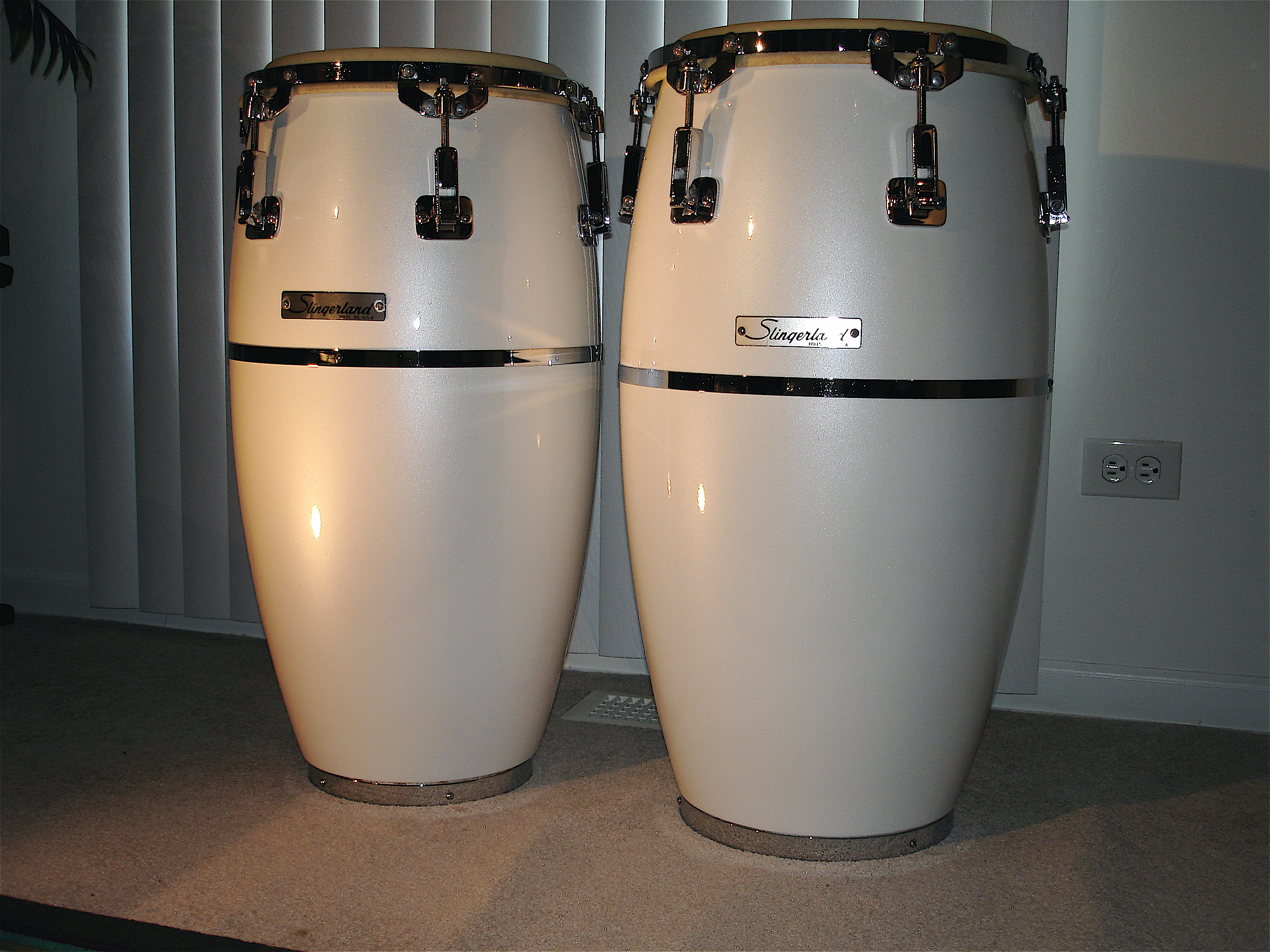 Hear is three photos of the finished Slingerland Conga Restoration Project. They came out very nice. The hardware cleaned up very nicely. One tip I have learned from a friend. If you want to clean up the chrome. Use a 0000 grade steel wool. It will remove pitting and clean it really nice. Then use a good car wax.