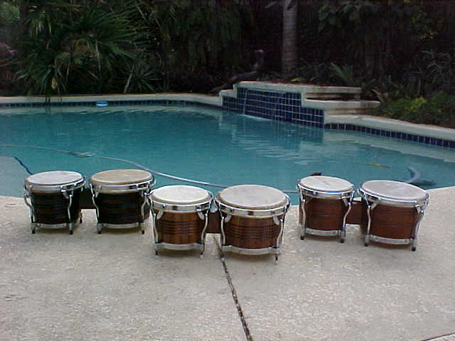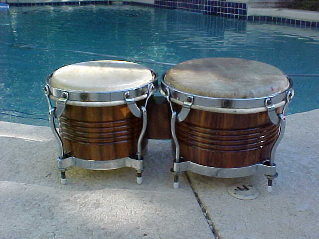 The timbalero/drummer plays bongo' on some traditional tunes. He is a friend of " el Sacerdote de la Rumba", who is my friend. He expressed a desire for a fibeglass LP bongo to take back. El Sacerdote called me and that's how it went. I put new heads on it. It's got a real big sound like Piernas or Junior Tirado's, the wood is beautiful, resembling zebra wood, very exotic.