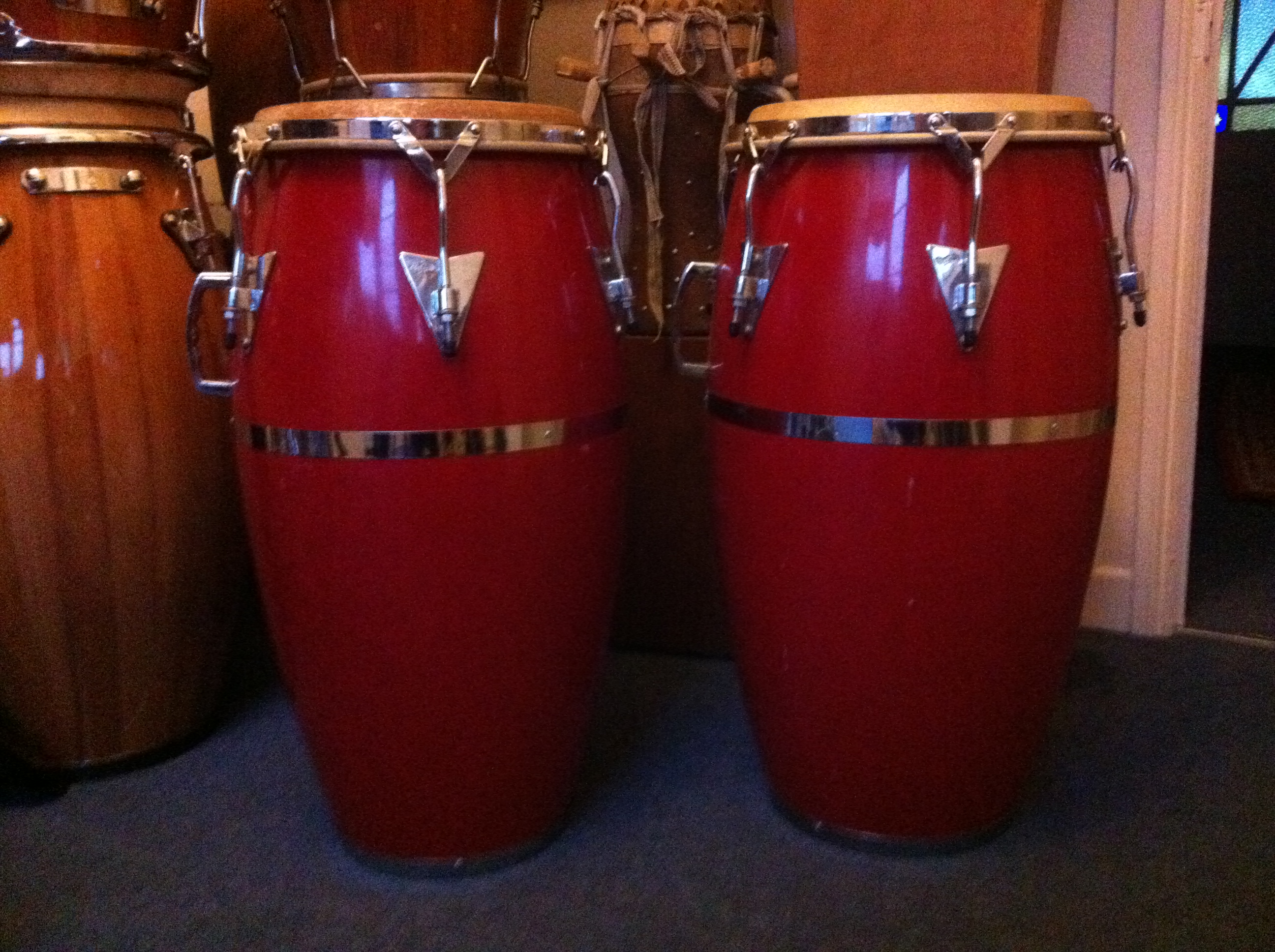 They are fibreglass, 28" tall, 11.75" and 12.5". They look like pretty close copies of LP to me, even the stand has the same design as LP with thick legs and wheels. Couldn't find any info on the net, so just curious to know something about the company. They sound pretty OK so I reckon I got a bargain!