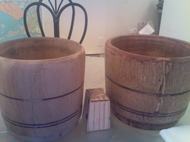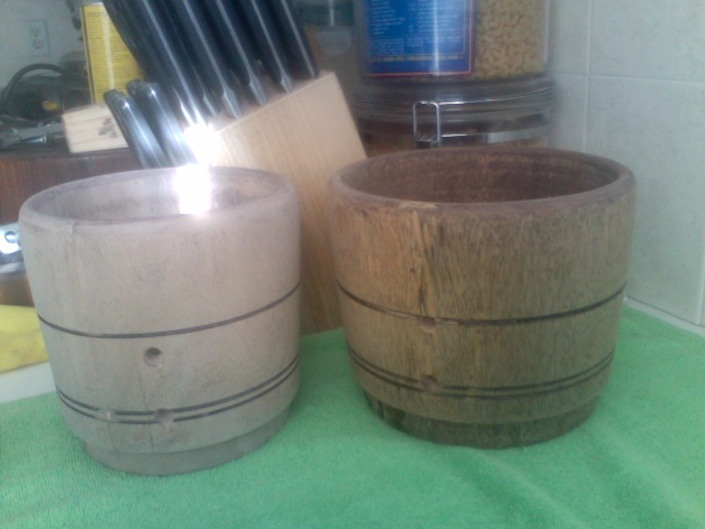 I'm currently in the process of bringing this rather flawed creation sold to me by Mr.Rivera to a decent level of looks and fortify what I can to the shell structure. I had a home improvement contractor quote me for the repair job I just spoke of and he laid a $240 price tag on me. None doing. Went to the Home Depot & picked up most of the essentials to do the job slowly with a lot of TLC and patience. Need a few minor tools to complete the job but will get this done and if the finish is to my liking it will be a keeper of mine. Onile gave me some great tips as well as a thread I read from Leedy2 on repairing stave bongos, and some staining and type of sanding grits to use from RitmoBoriqua,all very helpful. What I've posted is the drums when they first arrived, the state they are in presently, and a similar end product I wish to achieve (via Onile's photo) on my set of bongos. Onile's staining was a blend of Red Mahogany and Cherry. My stain blend will be a wee bit darker-American Chestnut and Bomby Mahogany Polyglades by Minwax (a polyurethane and stain blend). My progression will be slow but meticulous none the less. Con la ayuda de Dios y mis manos voy a comensar este trabajo. I'll post some pics of my progression. Adios Rumberos.