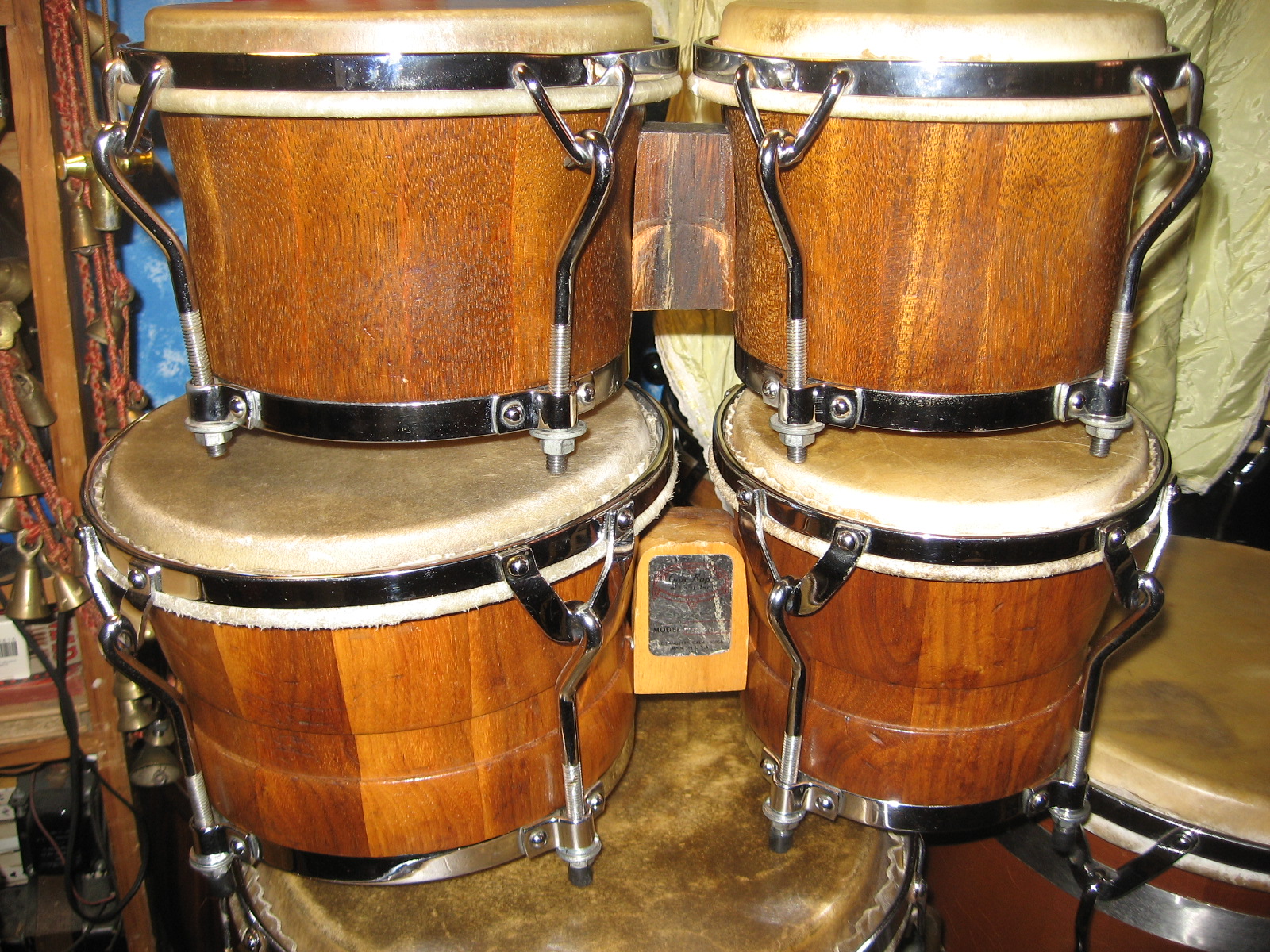 I have played Gon Bops Tumbadoras and Bongos for many years and are among my favorite drums, Cachete heard my favorite quinto on a couple of occassions in Puerto Rico and shortly there after got a sponsorship with Timba. I belive he still plays his Timbas or has his rumberos play them since his Illness. Ive owned Gon Bops since the 70's and have not had any problems with hardware except for the occassional striped tension hook. My GB Mahogany drums were played at a least 2 times a week at Rumbas, Bembes etc for many years while I lived in PR. with no major hardware issues. It may be the way I took care of them but that was minimal maintenance. Heres a photo of a couple of bongos with the peened on rivits in the bottom rim with which I have never had issues. I guess Im just lucky for the 40+ or so years Ive been playing. Of course my exposure to Timbas is just having played them, I think they sound great but have never owned a set so I will not comment on any 2nd hand opinions as to thier dependability.