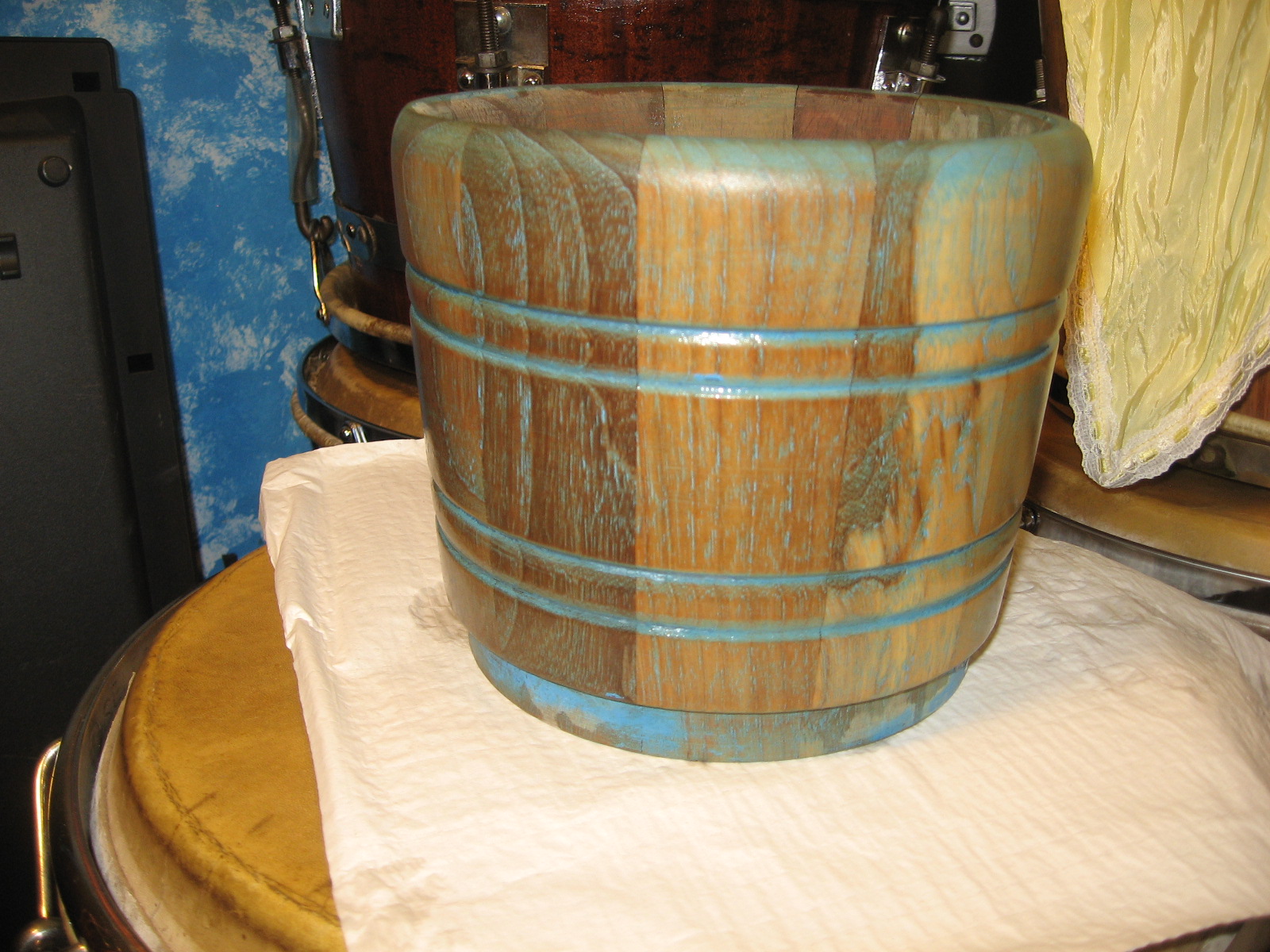 The processing of Caoba stopped around the mid 80's in Cuba. Those drums Marcelo saw were made prior to that time. I know the Fernando Ortiz factory (where SONOC were made) stopped processing Caoba tumbadoras, bongos and batas. Cuban cedro and roble (oak) were used in substitution. My Cuban Sonoc quinto is Cahoba, was brought over from Habana by Guille Garcia, who played for the rock group Chicago in the 70's. Guille brought back 5 Caoba SONOCS, which at one point in time were all mine. I recently was able to retreive back the quinto, which sounds awesome and is somewhat heavy. I which I would have kept them all, now that Matthew is on the scene. I sold them because the humidity in Miami made the staves split and the glue (cola) used in Cuba is of a very low quality. Photo of quinto and of the 5 I had, sold them about 10 yrs. ago.