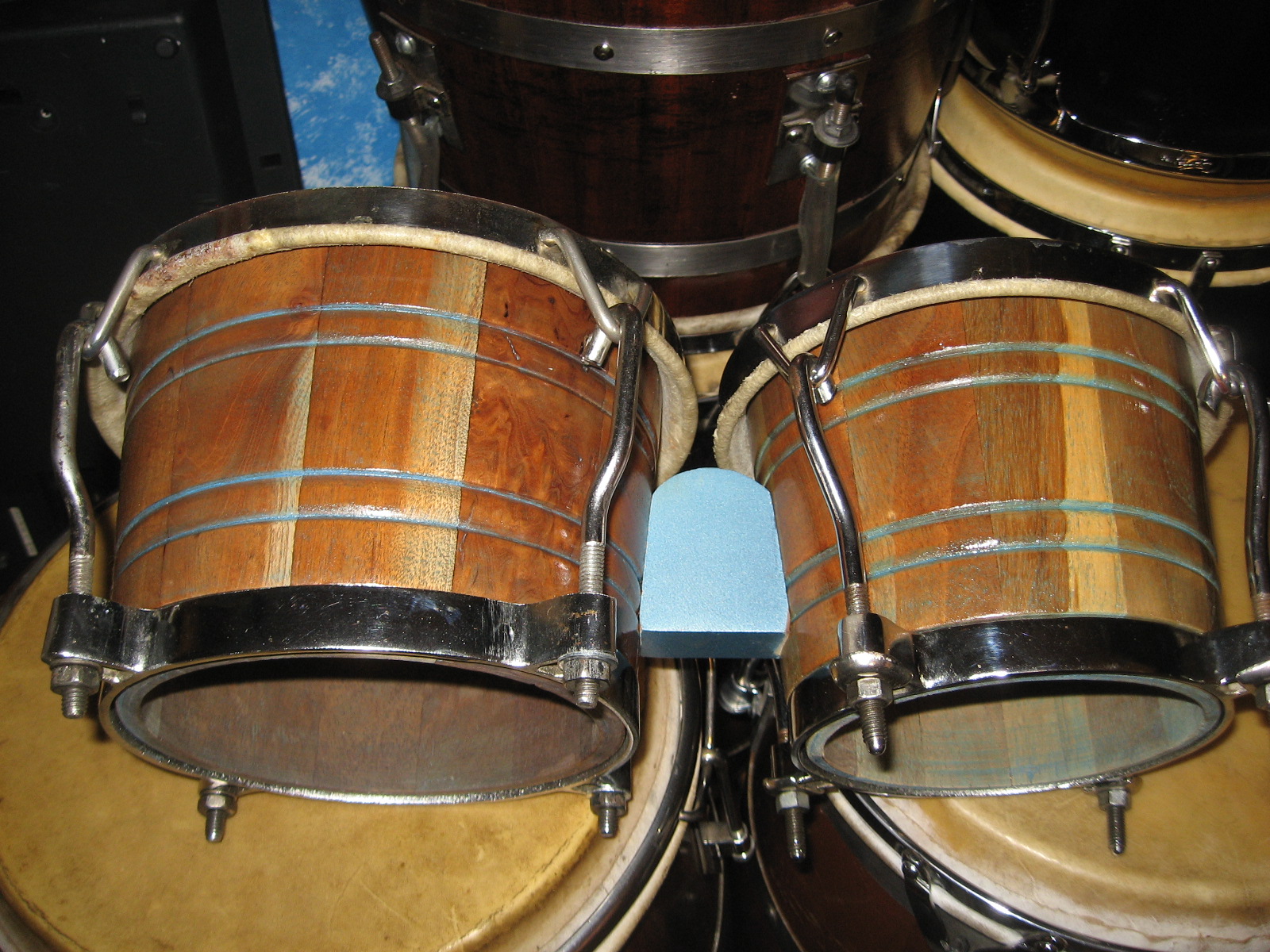 The processing of Caoba stopped around the mid 80's in Cuba. Those drums Marcelo saw were made prior to that time. I know the Fernando Ortiz factory (where SONOC were made) stopped processing Caoba tumbadoras, bongos and batas. Cuban cedro and roble (oak) were used in substitution. My Cuban Sonoc quinto is Cahoba, was brought over from Habana by Guille Garcia, who played for the rock group Chicago in the 70's. Guille brought back 5 Caoba SONOCS, which at one point in time were all mine. I recently was able to retreive back the quinto, which sounds awesome and is somewhat heavy. I which I would have kept them all, now that Matthew is on the scene. I sold them because the humidity in Miami made the staves split and the glue (cola) used in Cuba is of a very low quality. Photo of quinto and of the 5 I had, sold them about 10 yrs. ago.