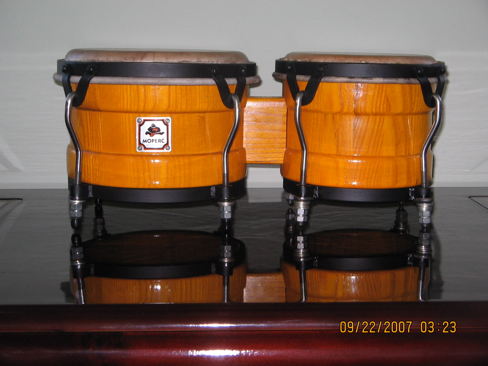 I own a Moperc Bongó since 2006 and have the same skins since the old ones were change to a thick Cow on the Hembra ( installed by timbas del Valle, no trick ) and another thinner cow on the macho which I mounted. The sound is loud,precise and clean old school specially the Martillo. Everywhere I play them been rehearsal or a gig I get good compliment about his sound and specially the yellow color with the black flat hardware. It is a Bongó that stand out of the rest. Just by looking at the shells you know it is a beautiful made superior sounding instrument. They are in the same league as others high end made by other artisans or may be in the league of his own. Also it is made cilindrical which project better than the conical type.