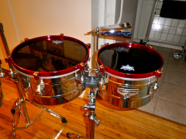 A makeover for my sets of timbals. Candy apple red translucent powder coat finish. UV and chip resistant finish. Company out of Long Island called Action Powder Coating did the job on the rims. They kept the integrity of the chrome finish and didn't have to sand blast it off to apply the powder coating. Drumheads are Remo Ebony Ambassadors. If interested Google them and send them a photo of what you want done to your hardware. I wasn't going to post anymore but I just wanted the community of the forum to enjoy some class added to some old warriors. Enjoy the eye candy.