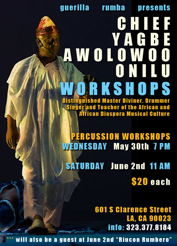 Los Angeles Afro-Cuban Song and Drumming Workshops with Chief Yagbe Awolowo Onilu Visiting from San Francisco, California, Chief Yagbe Awolowo Onilu will teach two Afro-Cuban song and drum workshops starting on May 30th, 2012 at Troy Parker’s space in Los Angeles.